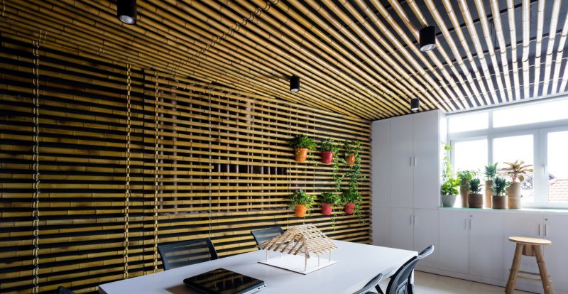 Жесткий, но легкий материал незаменим в эко стиле. Бамбуковые потолки не боятся влаги, имеют высокие эксплуатационные характеристики. Существуют следующие разновидности потолочных покрытий: