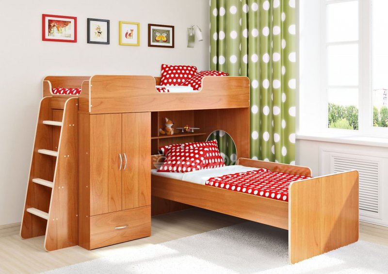Двухъярусная кровать приобретается, когда места в квартире немного, в одной комнате приходится размещать спальные места для двух-трех детей. Такой предмет подойдет возрасту старше трех лет, вплоть до подросткового. Кровать-чердак – разновидность двухъярусной, различные модели предназначаются для одного, двоих детей, оснащаются одежным шкафом, комодом, спортивным уголком, письменным столом.