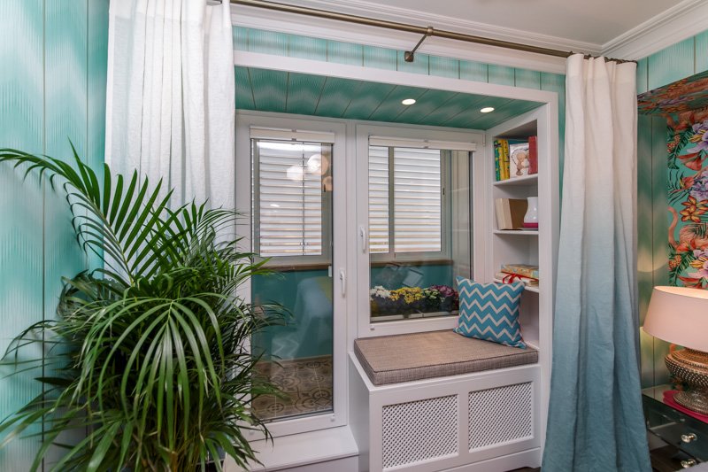 Для такой схемы выбираются шторы и пара кресел (или небольшой диван) в одном цвете. Мягкая мебель будет располагаться перед окном, на балконе или в противоположном углу комнаты.
