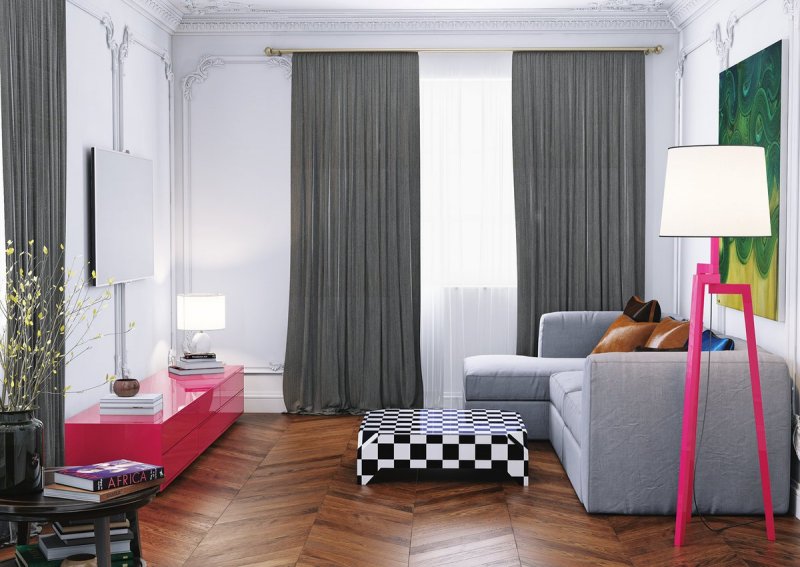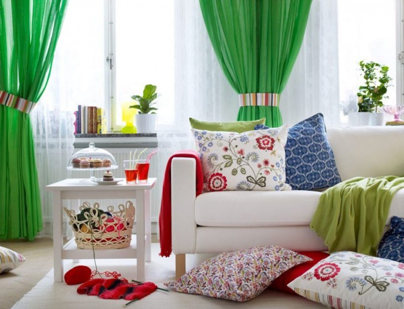Такой вариант уместен для светлых комнат. Выбранные занавеси будут выступать ярким акцентом, притягивающим взоры именно к окну. Логичным будет декорирование подоконника живыми растениями, неброскими подушками или другим декором.