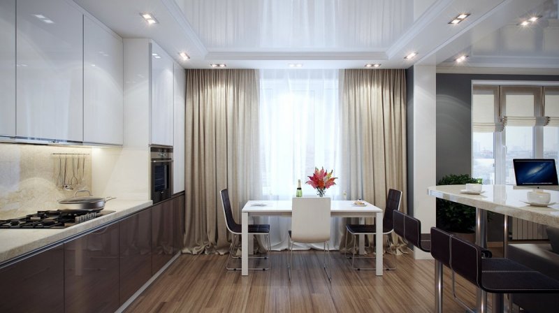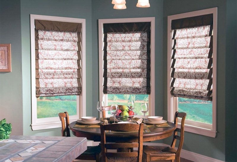 Практичным решением для кухни станет выбор коротких штор (до средины окна или до подоконника) из прямых тканей или с минимальным количеством волн. Уход за такими моделями будет простым и позволит обеспечить хорошее естественное освещение комнаты. Оптимальными можно считать рулонные и классические короткие модели. Это могут быть изделия из ткани со средней плотностью или легкие полупрозрачные полотна. Не рекомендуется выбирать для кухонь модель с выступающим узором или чересчур плотным плетением. Ввиду особенностей помещения, где проводится готовка, именно в таких полотнах будет постоянно скапливаться пыль и жировые частицы. И поддерживать их привлекательный вид будет довольно сложно.