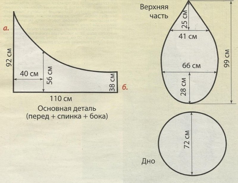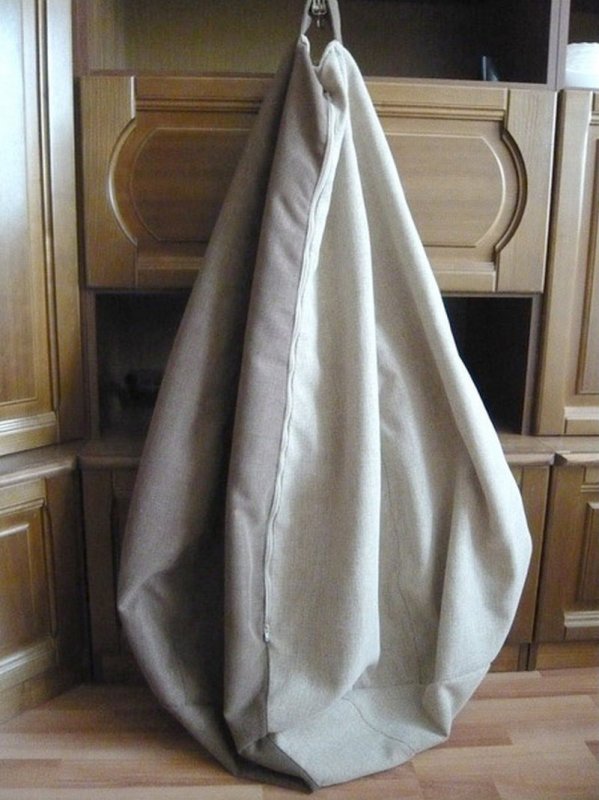 Практичная, комфортная мебель ценилась всегда. Она украшает внутреннее убранство в доме, помогает расслабиться после изнурительного рабочего дня. С постепенной популяризацией различных стилей в интерьере к предметам начали выдвигать особые требования. Кроме удобства, они не должны противоречить выбранному направлению в оформлении помещения, соответствовать моде. И хотя традиционные варианты остаются достаточно востребованными, все большую популярность приобретают бескаркасные изделия. Они очень привлекательны, мобильны. При желании и наличии швейной машинки можно без труда сшить кресло-мешок своими руками, самостоятельно создать пуфик, раскладной диван или кровать. Самодельные модели обойдутся в разы дешевле покупных аналогов. Содержание Особенности кресла Преимущества и недостатки бескаркасного кресла Выбор ткани для чехла Выбор наполнителя О размерах кресла Популярные модели и особенности пошива Кресло-груша Кресло-мяч Кресло-капля Пошаговый мастер-класс по шитью кресла Необходимые материалы и инструменты Выкройка и порядок пошива чехла Засыпка наполнителя Прямоугольное кресло из старых джинсов Как ухаживать за креслом-мешком Как выбрать кресло-мешок в магазине Заключение Особенности кресла Бескаркасные конструкции появились во второй половине 20 века. Они достаточно быстро получили признание, вошли в повседневную жизнь многих людей. Отсутствие жесткого, громоздкого каркаса – главная изюминка изделий. По сути, это большие мешки, которые имеют следующую структуру: Съемный (внешний) чехол. Это «лицо» рассматриваемого предмета. Для пошива применяют натуральные ткани, кожу, замшу. Его цвет, форма и размер могут быть разными. Внутренний контейнер. Это функциональный элемент, который удерживает наполнитель. Его производят из очень прочного материала, способного выдержать большие нагрузки. Он оборудован молнией, позволяющей убрать полностью, досыпать в случае усадки сыпучие вещества. Наполнитель. Используют, как природные компоненты в виде фасоли, гречневой шелухи, так и искусственные, например, вспененный полистирол, гранулы ПВХ. Кресло-мешок обеспечивает полное расслабление многим мышцам. Оно достаточно безопасно и надежно, поэтому его часто устанавливают в детских комнатах, не переживая за здоровье малыша. Также его можно встретить в спальне или гостиной. При выборе специальной ткани, обработанной водоотталкивающими веществами, готовую продукцию используют на террасе, в беседке, в саду, некоторые ее берут на рыбалку, природу. Преимущества и недостатки бескаркасного кресла Мягкое изделие является отличной альтернативой стандартным моделям. Оно способно украсить любое помещение, вписаться в выбранный стиль. Под весом человека кресло приобретает особую форму, что позволяет отдыхающему максимально расслабиться, провести с комфортом время за чтением книги, просмотром любимых телевизионных передач, общением в кругу семьи. Такая конструкция имеет ряд положительных качеств, но не лишена и недостатков. Среди основных преимуществ можно выделить: Мобильность. Готовый продукт характеризуется малым весом, часто оборудуется специальной ручкой, расположенной на крышке. Это позволяет без особых усилий перемещать его по квартире, передвинуть или переставить на другое место. Польза для здоровья. Врачи рек
