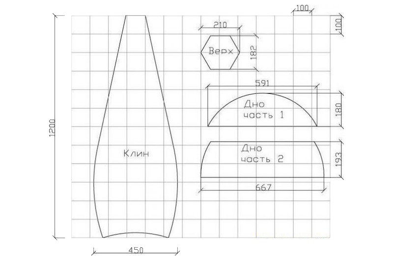 Для пошива такой модели используют специальные чертежи – чаще это несколько клиньев и круглое дно. Для экономии материи лекала раскладывают компактно, максимально сближая узкую и широкую часть.