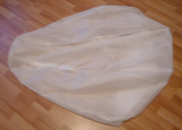 Набивка – самый последний, ответственный этап при изготовлении кресла-мешка. Один из чехлов необходимо наполнить на 2/3 пенопластовыми шариками. Сразу переворачивать пакет с наполнителем в мешок нельзя, особенно пытаться подтолкнуть гранулы руками. Воздушные и непослушные элементы разлетятся белым снегом по всей комнате.