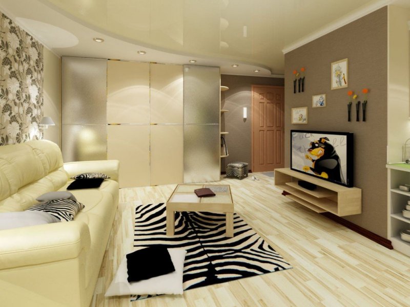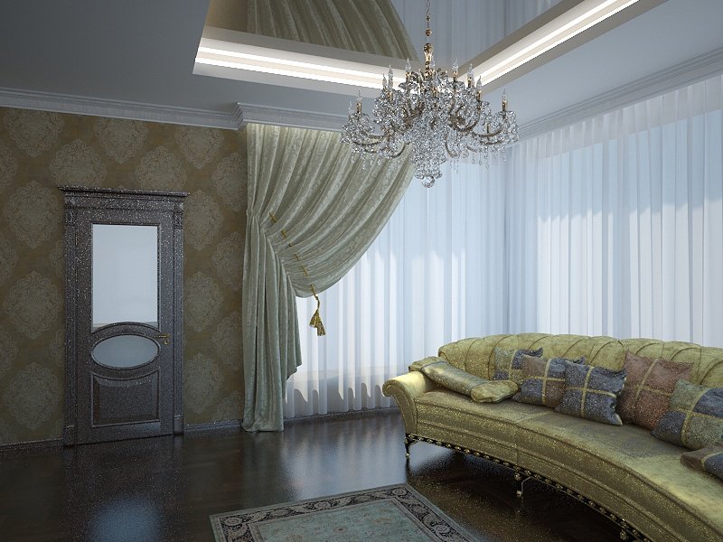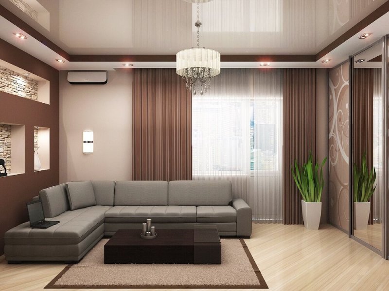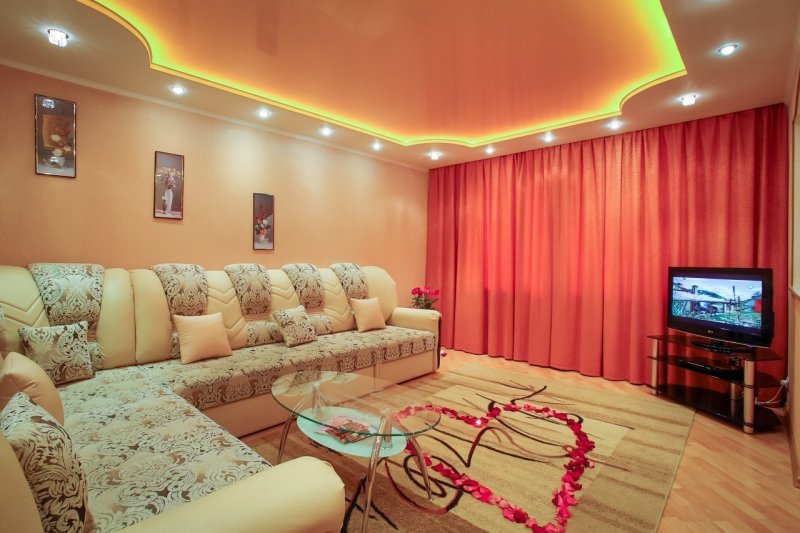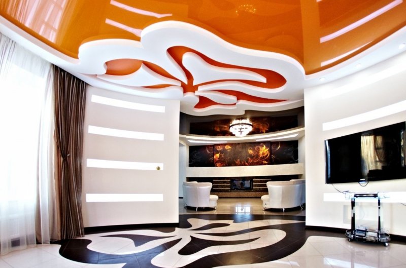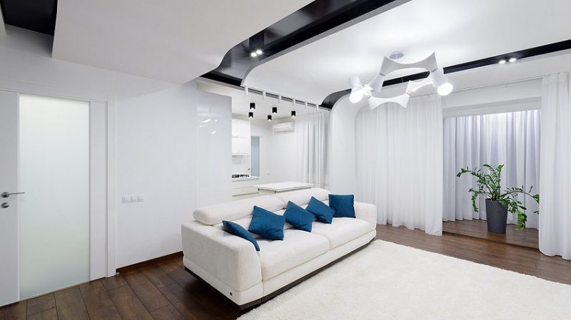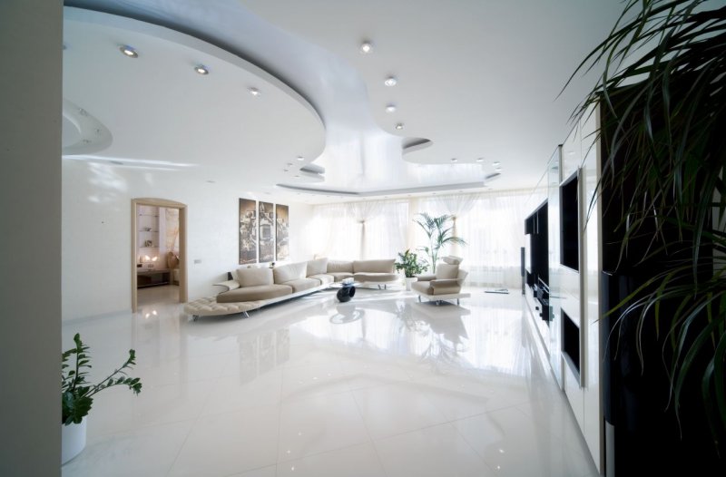 В интерьерах гостиных часто встречаются потолки изогнутой формы из гипсокартона. Плавные линии с подсветкой создают впечатление динамичности пространства и текучести. Такой эффект должен поддерживаться планировкой и динамикой цвета. С помощью двухуровневого потолка можно изменить геометрию гостиной, создать в комнате общего пользования определенное настроение.
