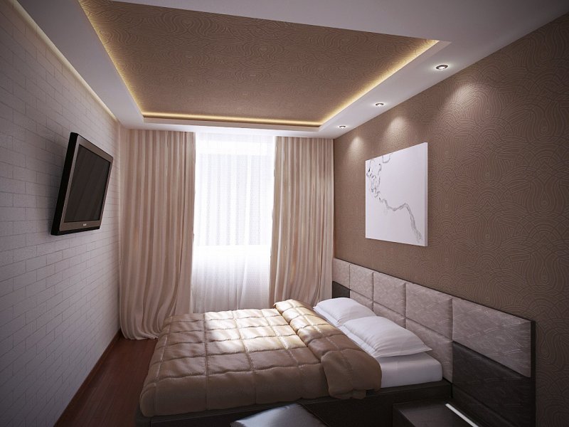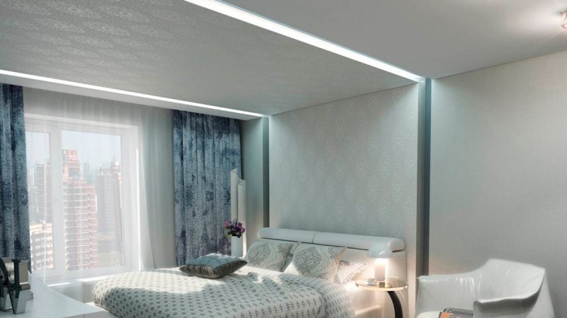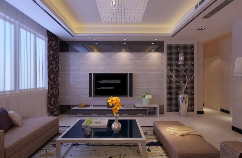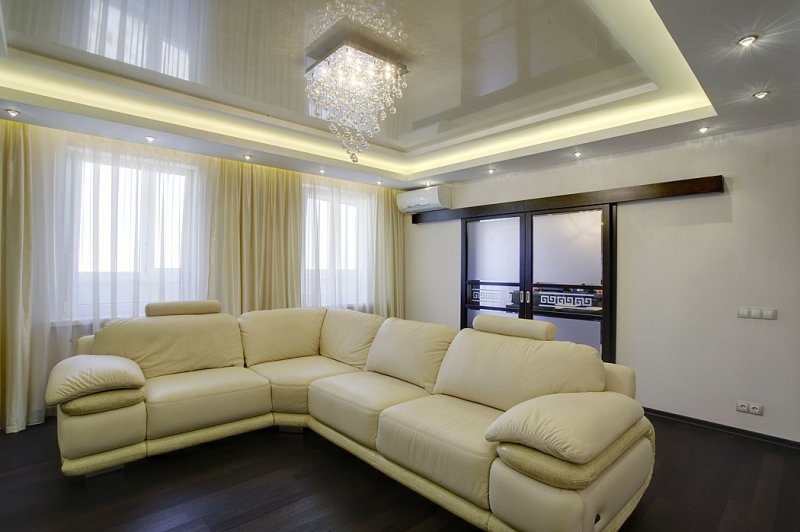 В комнате отдыха потолок в два яруса играет декоративную роль. Он первый бросается в глаза при пробуждении и последний провожает в сон. Благодаря конструкции можно использовать освещение различной интенсивности, создавать красивый рельеф и невообразимые линии. На большой платформе в центре размещают красивую люстру, по периметру можно расположить светодиоды. Подсветка с плавными, мягкими переходами создает романтическое настроение.