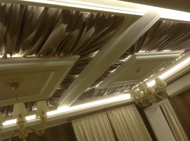 Традиция оформлять потолок в несколько уровней была еще в царских обеденных покоях. Главное преимущество таких конструкций – надежная маскировка коммуникаций, неровностей, шероховатостей поверхности, балок и проводов, проходящих по потолку.