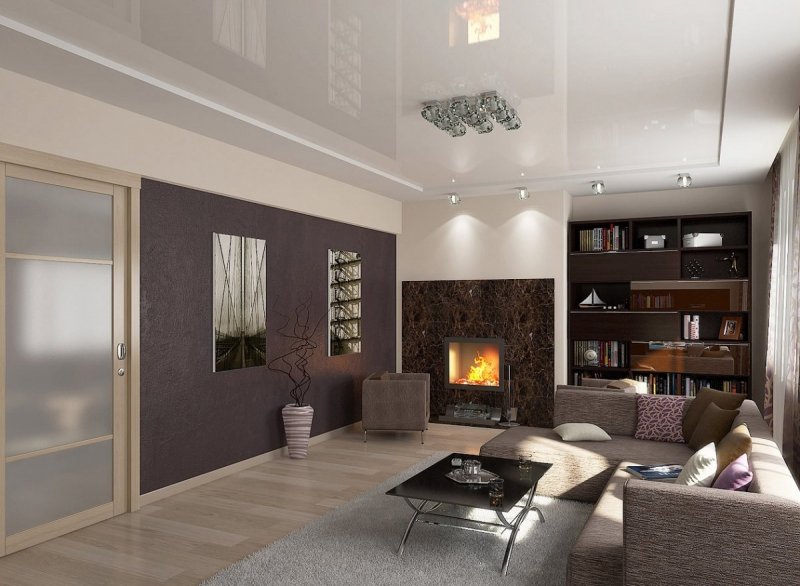 Обычно в просторной комнате двухуровневые потолки используются с целью зонирования пространства. Над местом отдыха с диваном и телевизором размещают низкую часть потолка. Это может быть участок у стены или центр гостиной. Рабочую или обеденные зоны обозначают высокие участки. Такой способ разделения подходит для больших помещений, в остальных случаях лучше использовать мебель и перегородки.