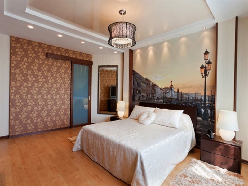 Многоуровневые потолки хорошо подавляют шум, позволяют не акцентировать внимание на неровностях. Отлично будет смотреться в спальне зеркальная поверхность в несколько ярусов, закрепленная на металлическом каркасе. Такой прием визуально раздвигает границы комнаты, наполняет спальню светом, делает ее объемной и просторной.