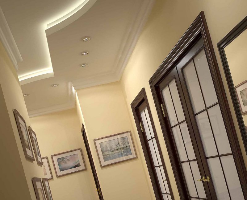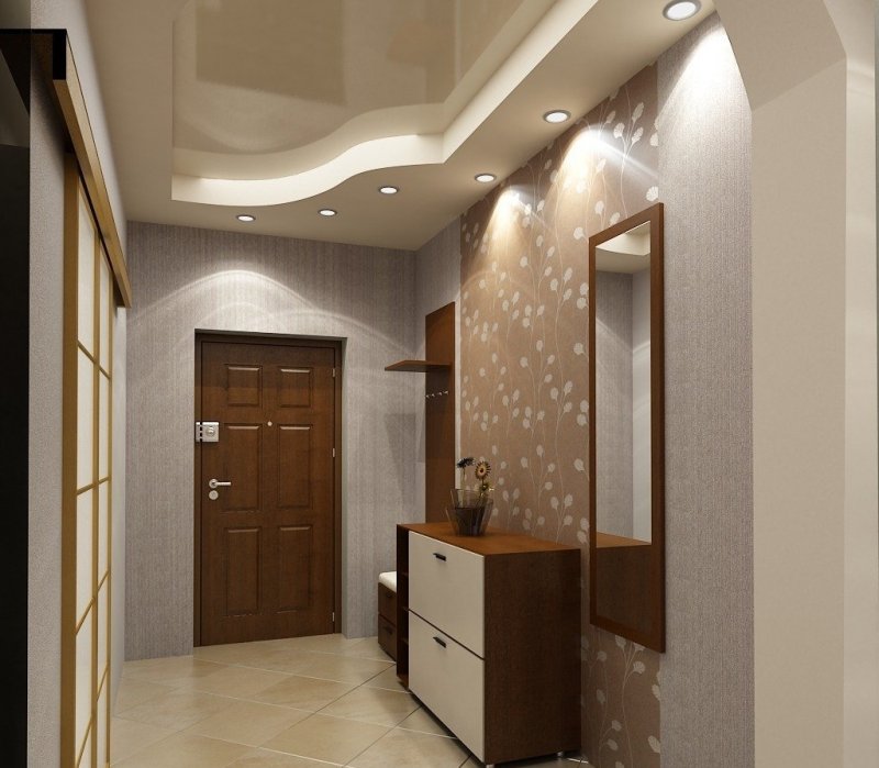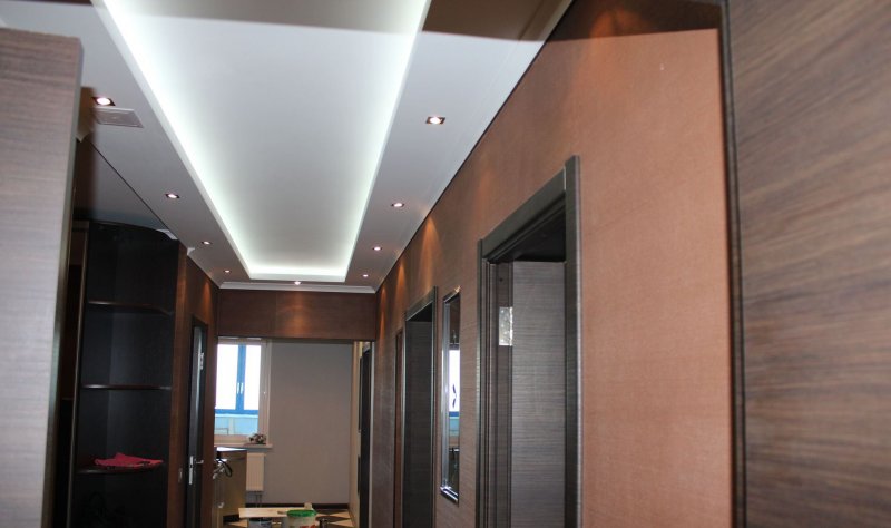В помещении с небольшой площадью намного легче осваивается технология отделки. Потолки в прихожей можно буквально преобразить, сделав их в два яруса. Можно сочетать гипсокартон и ПВХ пленку. Такие конструкции зрительно поднимают потолки, дают возможность устанавливать высокие гардеробные шкафы без риска повредить полотно.