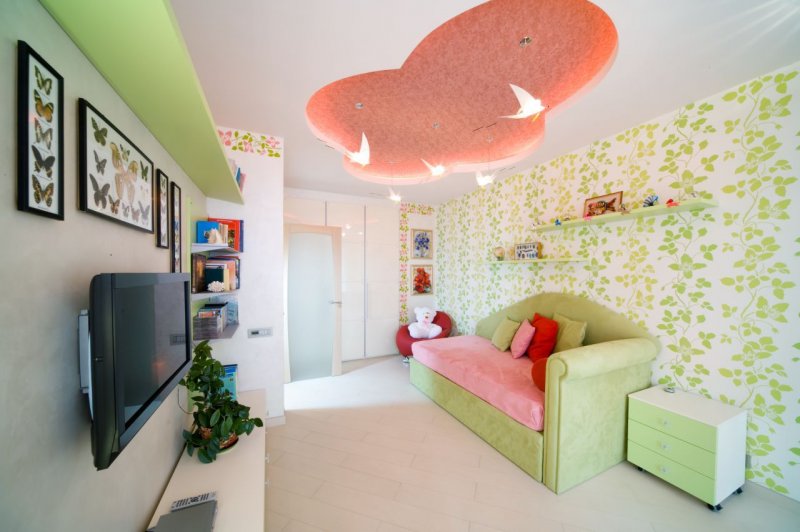 Многоуровневые потолки в детской с подходящим по возрасту принтом не должны быть долговечными, поскольку ребенок вырастет и потеряет интерес к картинке. В подростковой комнате потолок должен соответствовать общему стилю помещения.