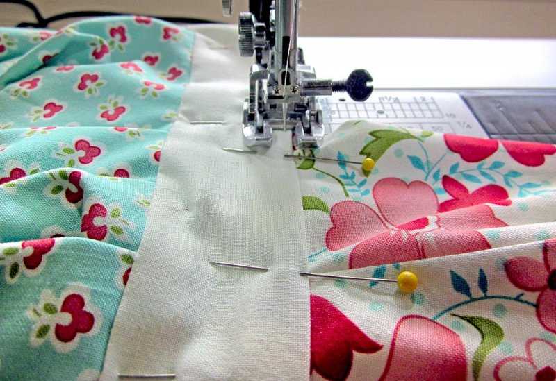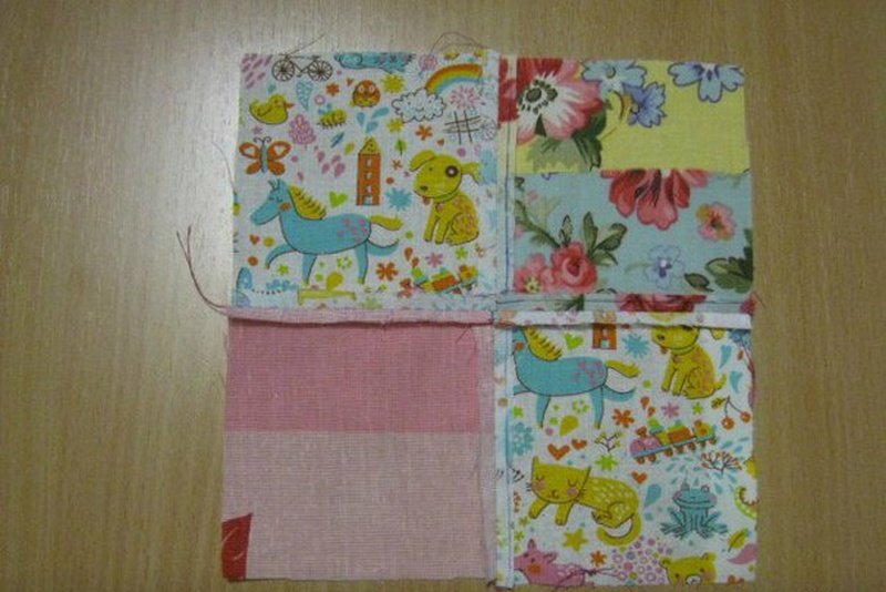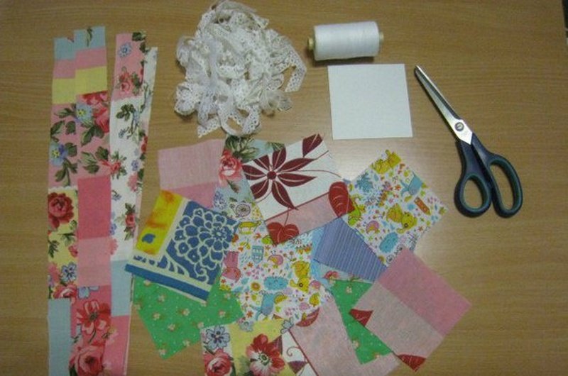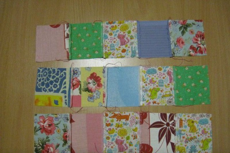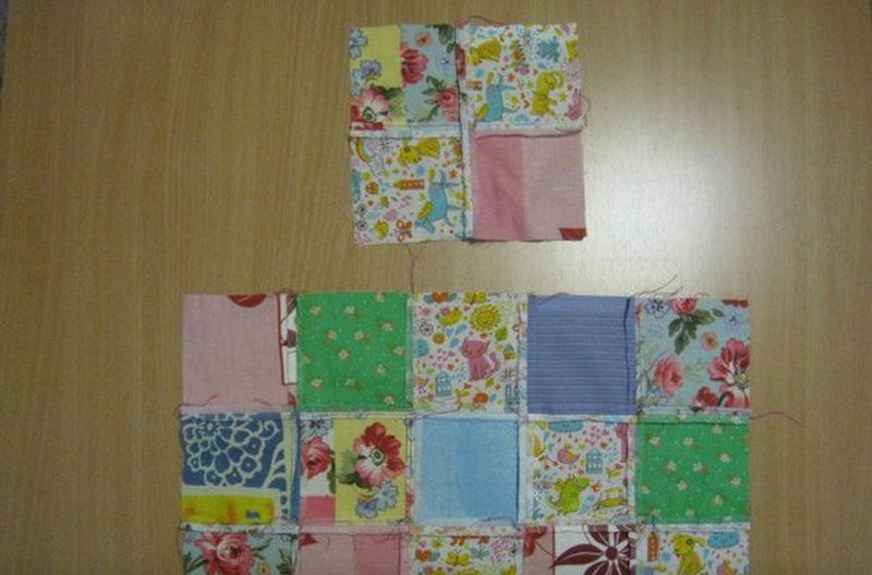 Для работы подготавливаем 30 лоскутов одинакового размера. Они могут быть разной формы, но начинающим швеям проще будет работать с одинаковыми квадратами. Соединяем 6-ть штук в полосу и сшиваем. Также делаем еще 3-и заготовки. Теперь складываем их в большой прямоугольник и сшиваем вдоль. Соединяем 4-и квадрата и располагаем по центру основной детали. Еще из 2-х квадратов формируем верхнюю часть фартука.