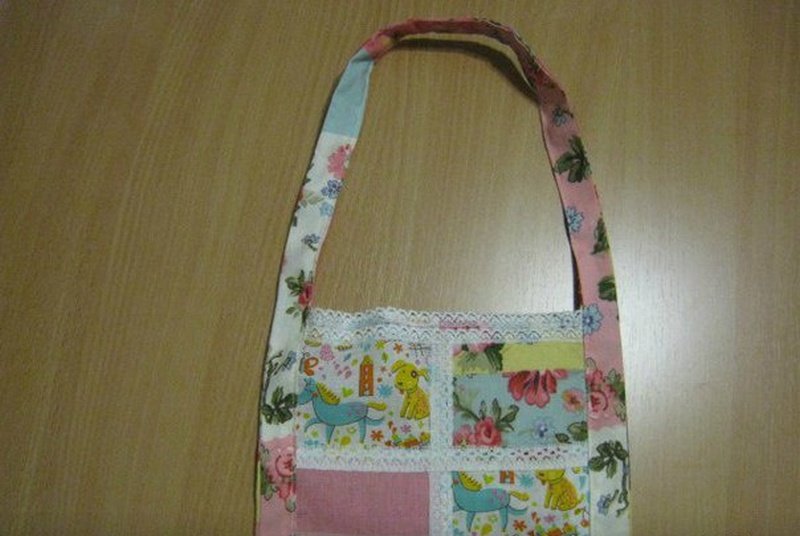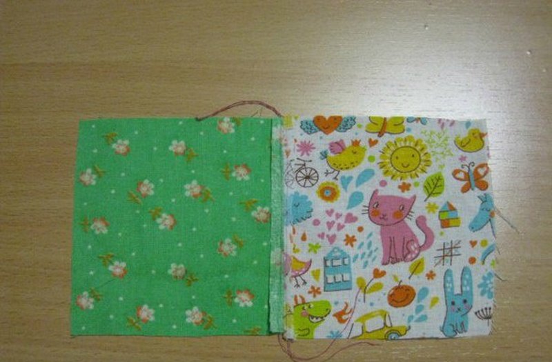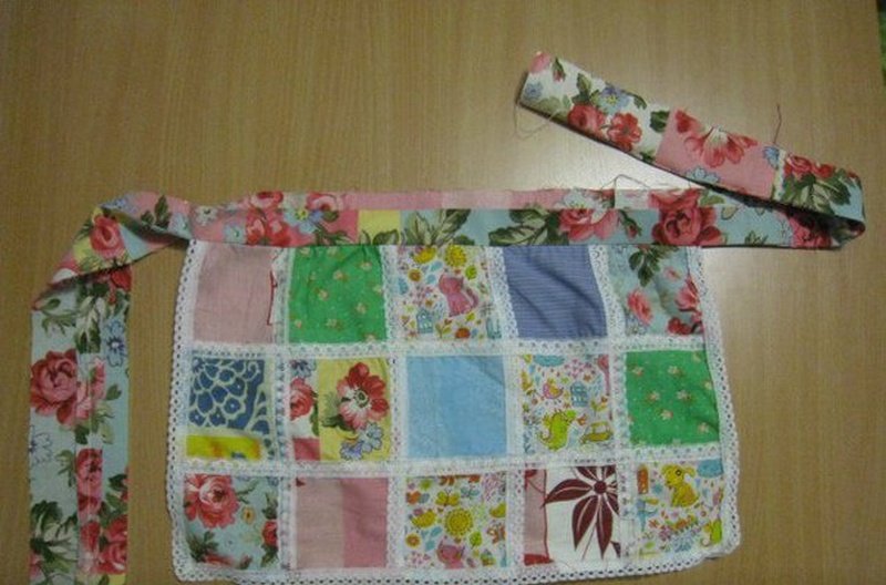 Можно оставить передник в первоначальной форме или сделать выемки. Для этого складываем изделие пополам, отмечаем на крайнем квадрате во втором ряду плавный изгиб и отрезаем часть ткани через оба слоя. Скрыть большое количество швов с внутренней стороны поможет подкладка. Прикладываем будущий фартук к кусочку однотонной ткани, вырезаем по контуру с небольшим запасом. Прикладываем друг к другу обе детали изнаночными сторонами и сшиваем. Отделываем края белыми полосами. Из такого же материала можно смастерить завязки.