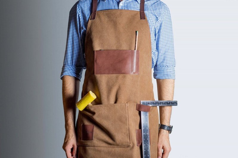 Фартук для папы может быть не только кухонным. Для работы в гараже, по дому также понадобится надежная защита одежды. Обычно это тканевая повязка на пояс с множеством карманов для хранения инструментов. Такой передник можно украсить скромной вышивкой, наклеить именную наклейку.