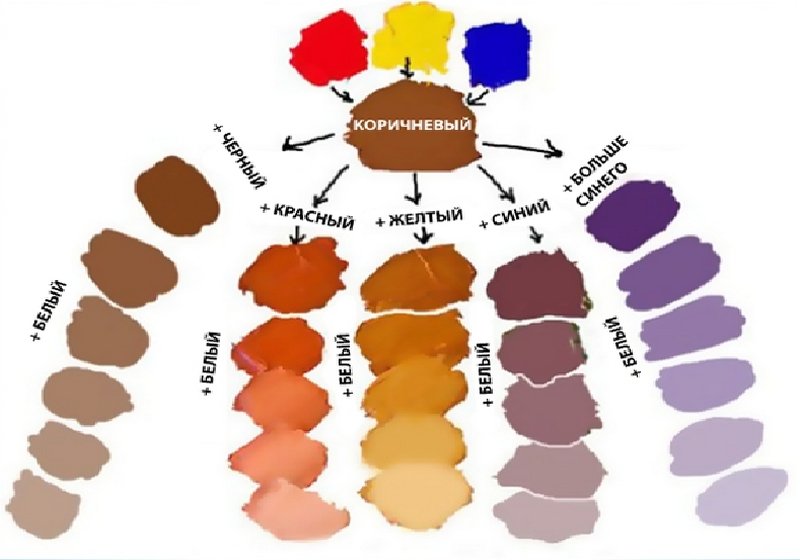 Коричневый получается путем смешивания нескольких пигментов. Опытные специалисты могут идеально рассчитать нужные пропорции трех основных цветов. Однако на практике удобнее мешать по 2 цвета, причем постепенно. Классическими комбинациями для синтеза коричневого тона являются сочетания красного и зеленого, оранжевого и синего, а также фиолетового и желтого. В каждом из случаев одна краска используется как основа, а другая постепенно формирует нужный классический оттенок коричневого. Так, в зеленый нужно добавлять красный, в оранжевый синий, а в фиолетовый желтый. Добавляемого пигмента обычно должно быть намного меньше. Другие пропорции слияния дадут разные, непохожие между собой оттенки коричневого и других составных цветов. Коричневый можно получить и путем смешивания в небольших количествах всех цветов радуги.