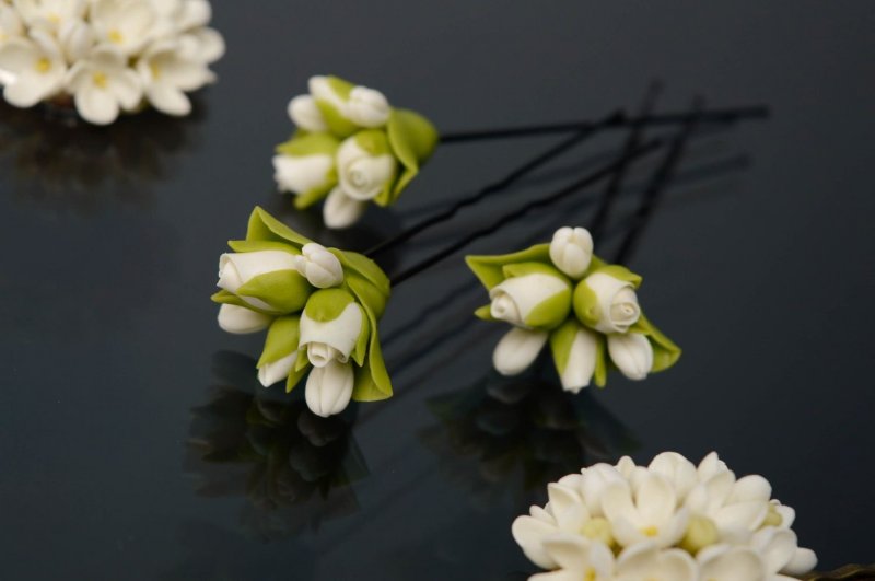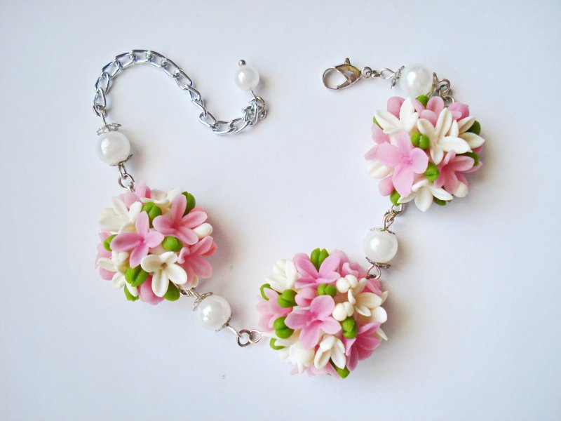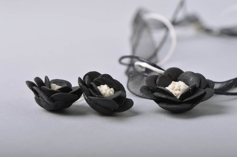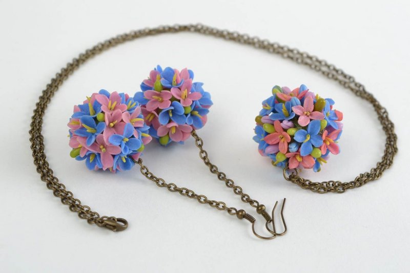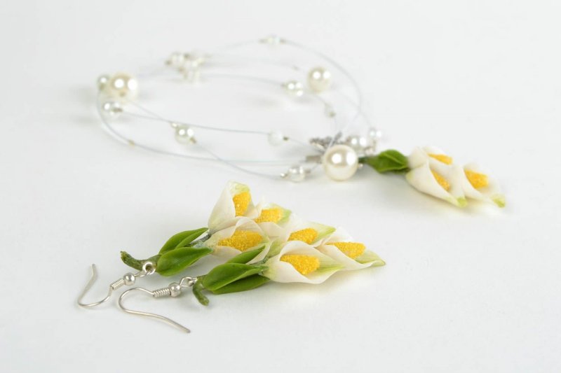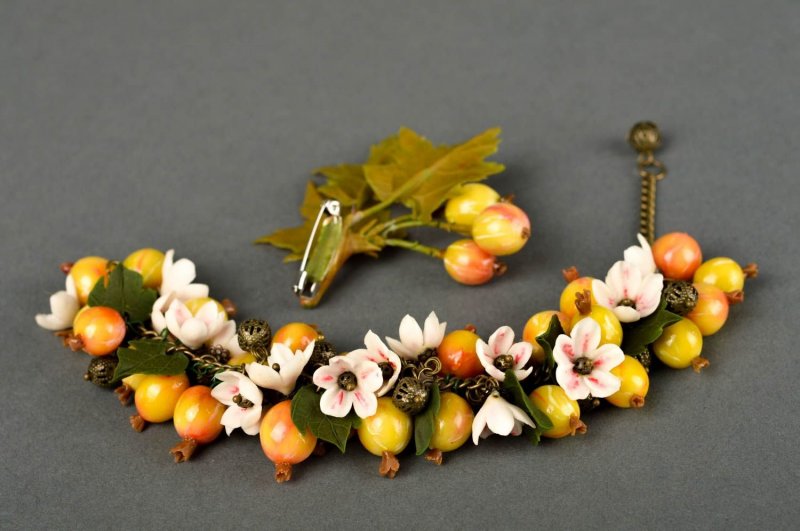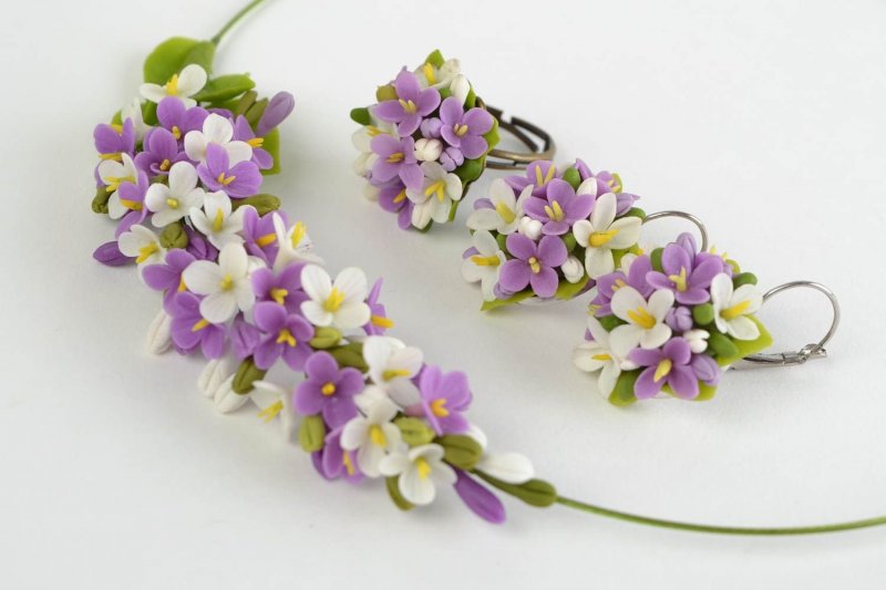 Из холодного фарфора получаются необычные украшения: медальоны, брошки, серьги, клипсы, браслеты, кулоны, заколки. Конечно, материалом только декорируют основу, но смотрится деталь образа поистине элегантно и стильно, особенно в условиях повышенного спроса на изделия handmade. Из холодного фарфора обычно изготавливают миниатюрные цветочные бутоны, листья, стрекоз, бабочек, дольки фруктов, ягоды, бусинки.