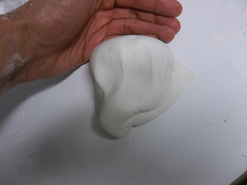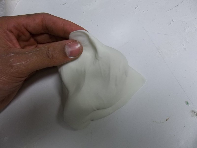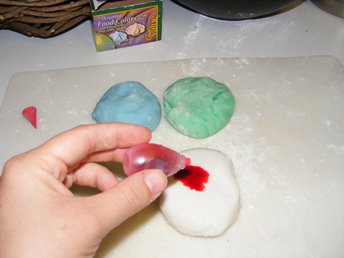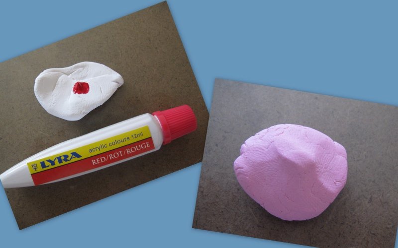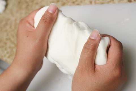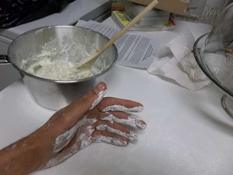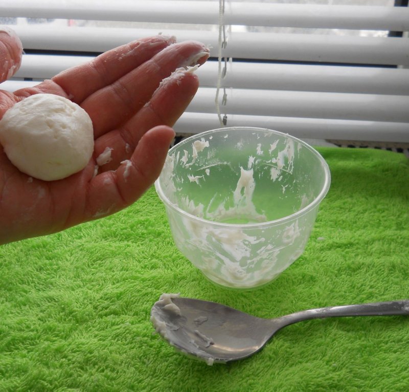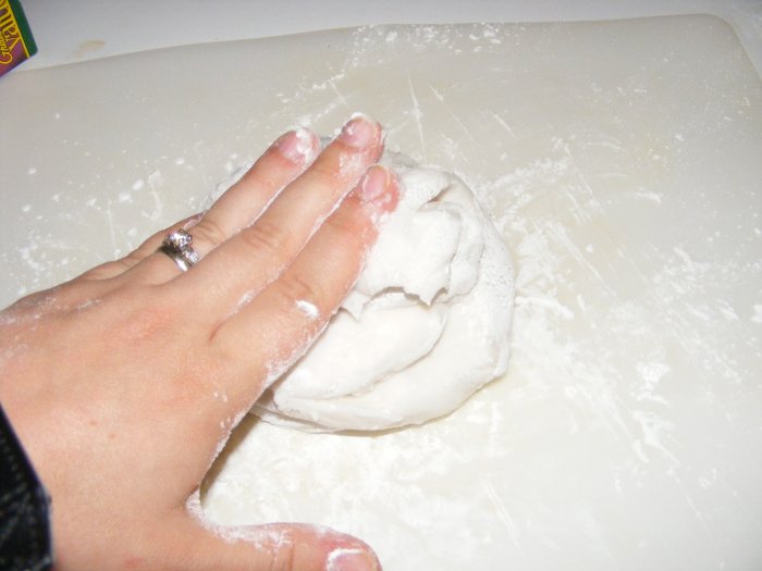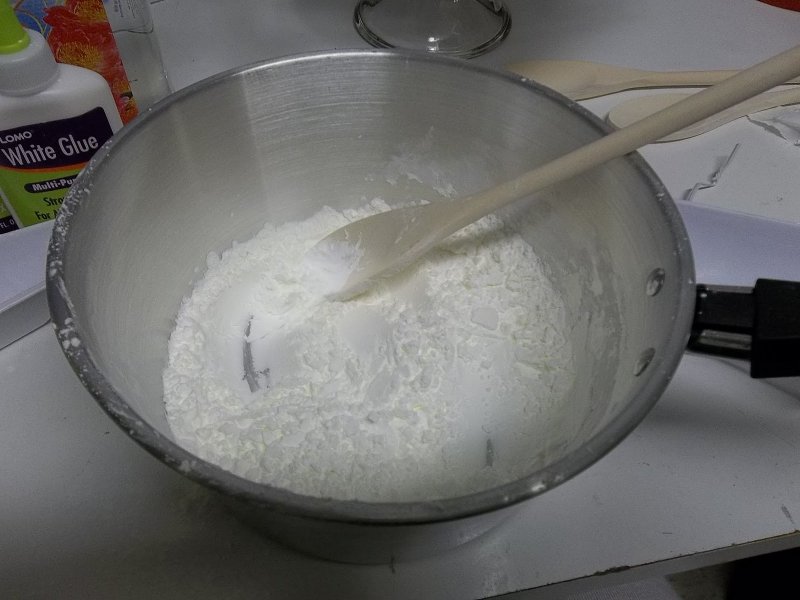 Сначала необходимо смешать крахмал и мел. Затем порошок заливают клеем и добавляют к нему вазелин. Тесто тщательно вымешивают, после чего добавляют формалин. Массу разминают заново, чтобы последний ингредиент равномерно распределился. Если готовое тесто получилось слишком ««крутым»», к нему можно добавить немного холодной воды. Если масса, наоборот, слишком податливая и плохо держит форму, то к ней добавляют еще немного крахмала или мела. В процессе смешивания ингредиентов можно всыпать пищевой краситель, если нужно получить тесто какого-то определенного цвета.