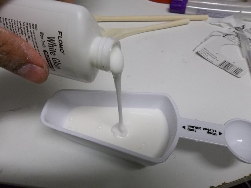 Для этого рецепта используют не формальдегид в чистом виде, а его раствор под названием формалин, который свободно продается в аптеках. Этот состав печально известен, как один из лучших бальзамирующих растворов. Он токсичен, поэтому нельзя допускать контакта со слизистыми и открытыми участками кожи. Работать можно только в перчатках. Нельзя вдыхать пары формалина. Не подпускайте к средству детей. В следующем примере тоже будет присутствовать раствор формальдегида, поэтому там следует соблюдать эти же предосторожности. Ниже приведен рецепт для изготовления большого куска теста. Если массы для лепки нужен минимум, то можно взять меньше ингредиентов, но с соблюдением приведенных пропорций. Итак, для работы потребуются: