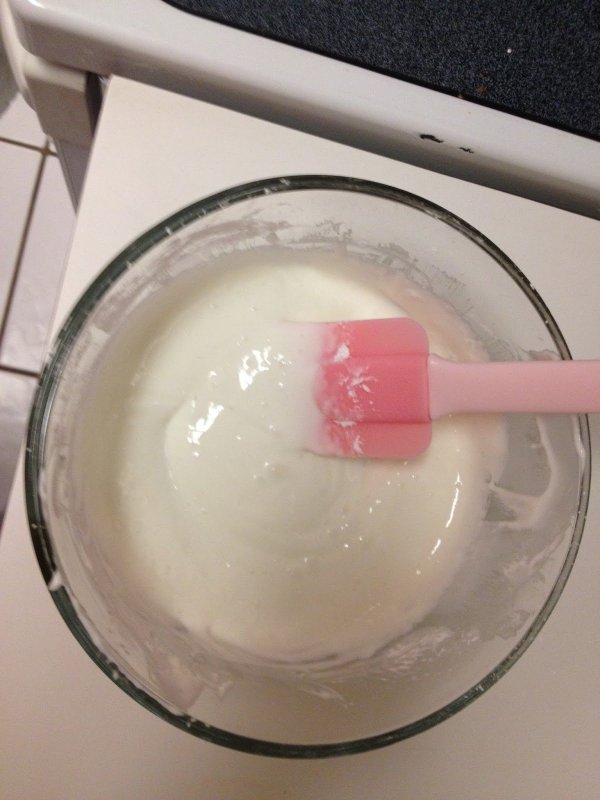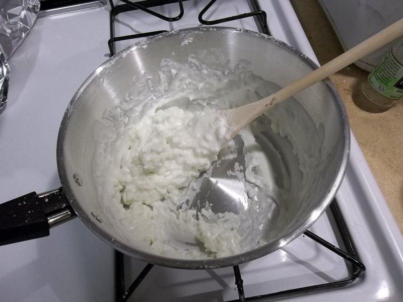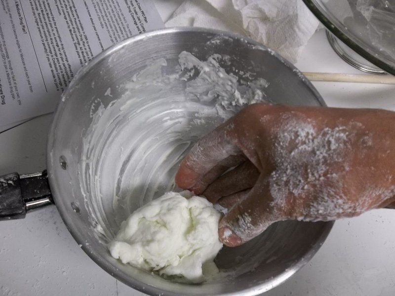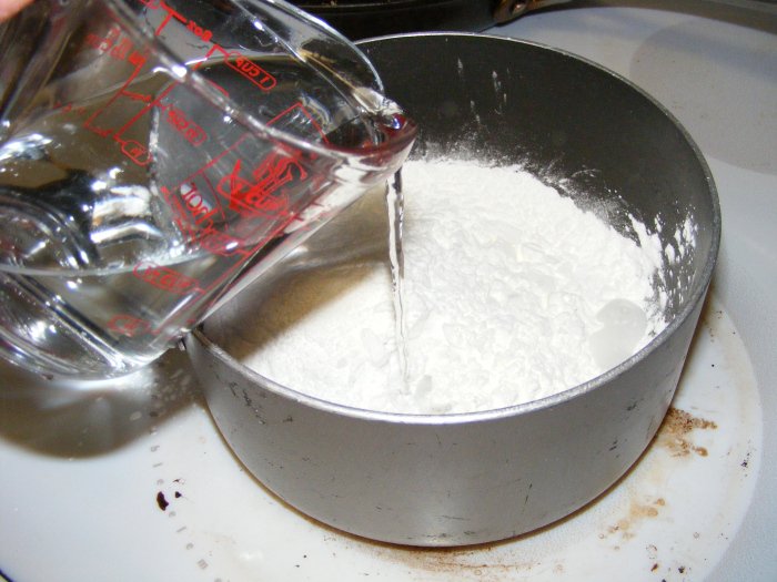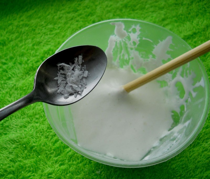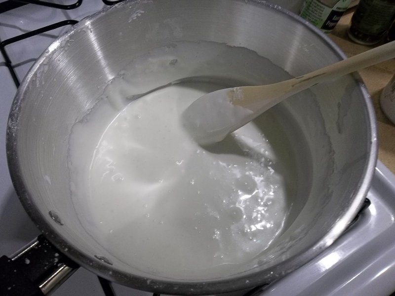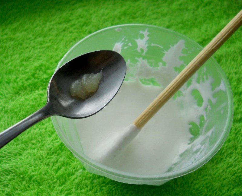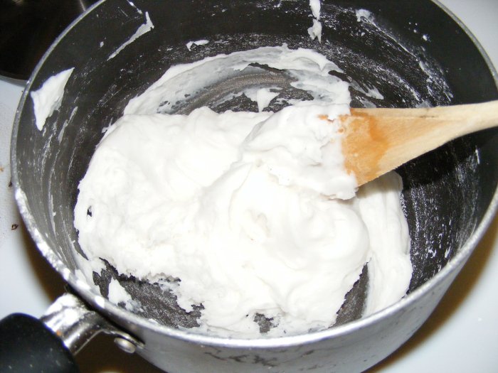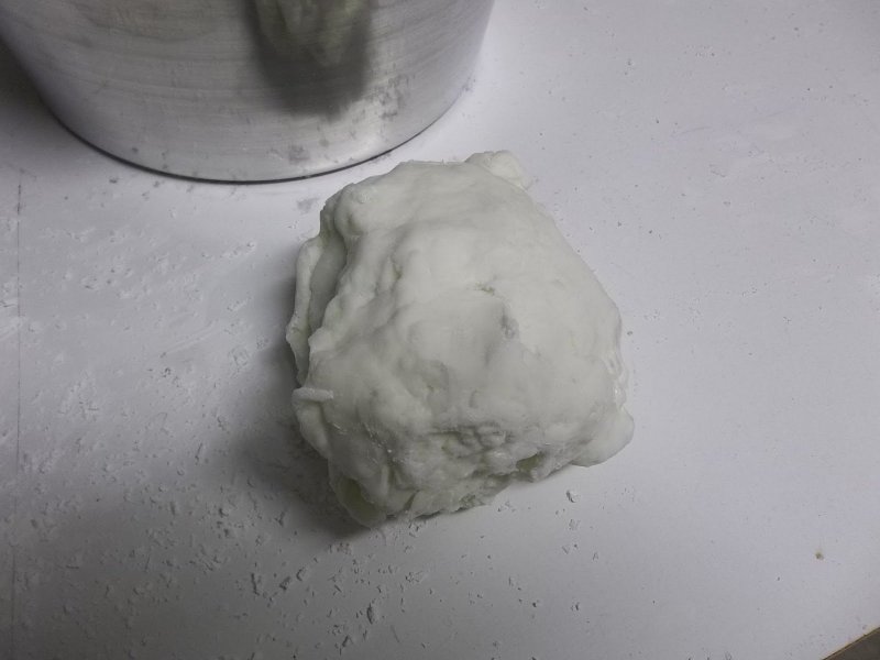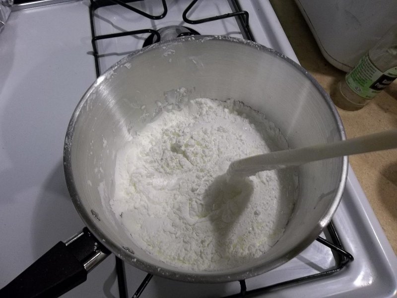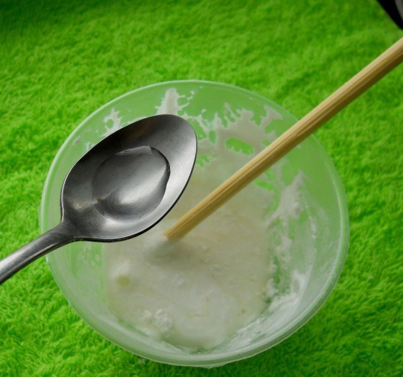 Все ингредиенты, кроме крахмала, тщательно замешивают в емкости из прозрачного стекла. После этого массу отправляют в СВЧ-печь. Время ее подогрева придется определять индивидуально опытным путем, так как мощность микроволновки может быть разной. Главный признак «готовности» жидкого теста — активное образование пузырьков, которые создают «шапку», быстро ползущую вверх, как в молоке. После этого емкость нужно срочно снимать. Не давая тесту остынуть, в него высыпают крахмал и потихоньку замешивают. Сначала ложкой, по мере уплотнения массы начинают работать руками. Когда тесто станет упругим и плотным, оно почти готово, осталось только дать ему немного времени «отдохнуть».