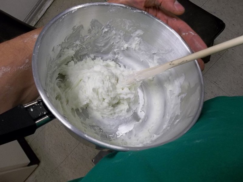 Все ингредиенты смешивают в эмалированной кастрюле или в сковороде с высокими бортиками. Емкость ставят на маленький огонь. Когда масса начнет пузыриться, ее слегка помешивают, скрепляя маленькие комочки в один большой. После испарения воды и загустения теста, емкость снимают с огня. Осторожно, специальным инструментом (лучше большой ложкой), ком вынимают из сковороды и кладут на деревянную доску остывать. Нельзя брать мастику руками, так как она горячая. Когда температура теста упадет, его нужно тщательно размять до консистенции мягкого пластилина. Работать с массой лучше после того, как она пару часов «отдохнет», а не сразу же после остывания.