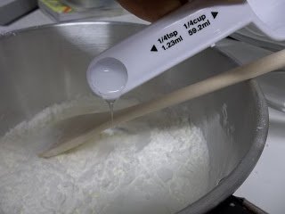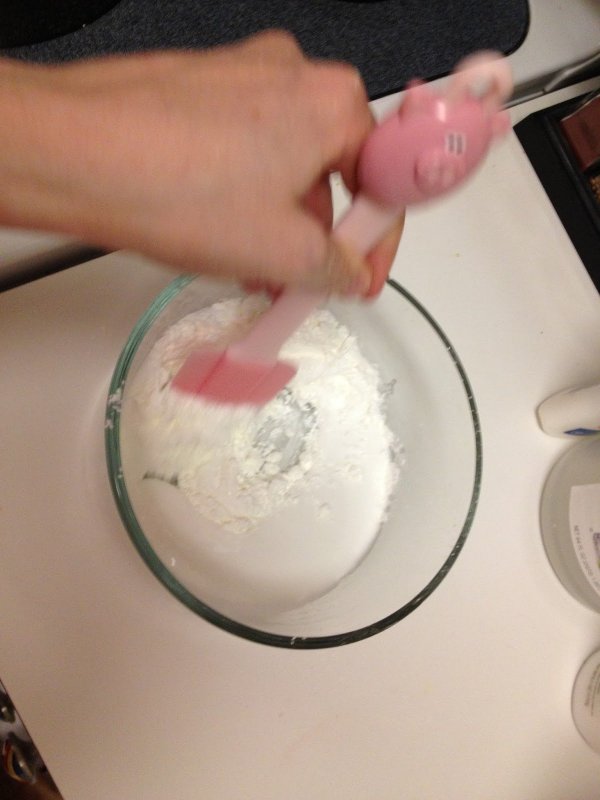 При желании в состав холодного фарфора можно добавить пищевой краситель или смесь из 1-2 ст. ложек рисового крахмала и 1 ч. ложки бензоата натрия, если массу нужно отбелить. Ингредиенты смешивают: