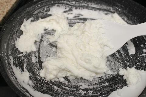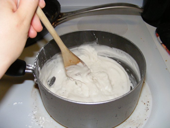 Холодный фарфор готовят в сковороде с высокими бортиками. Сначала смешивают клей и крахмал. Потом в массу добавляют остальные ингредиенты и ставят на медленный огонь. Сначала тесто будет жидковатым, а по мере варки начнет постепенно густеть. Главное, не дать ему «пригореть», своевременно помешивая. Затем масса будет напоминать творог, а в конечном счете станет эластичной, как детский пластилин для лепки. Главное условие «готовности» холодного фарфора — свободное отлипание от стенок сковороды.