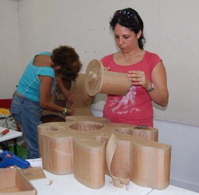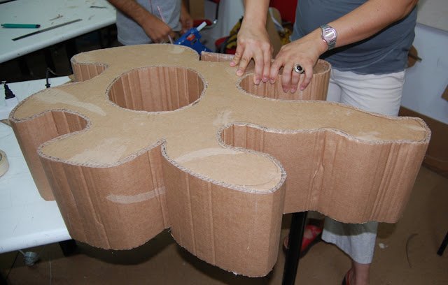 После тщательной обработки приступают к сборке и креплению всех элементов между собой. Соединять картонки можно с помощью специальных пазов, скотча и клея. Чтобы изделие имело аккуратный вид, неровности в местах срезов и стыков заделывают шпаклевкой.