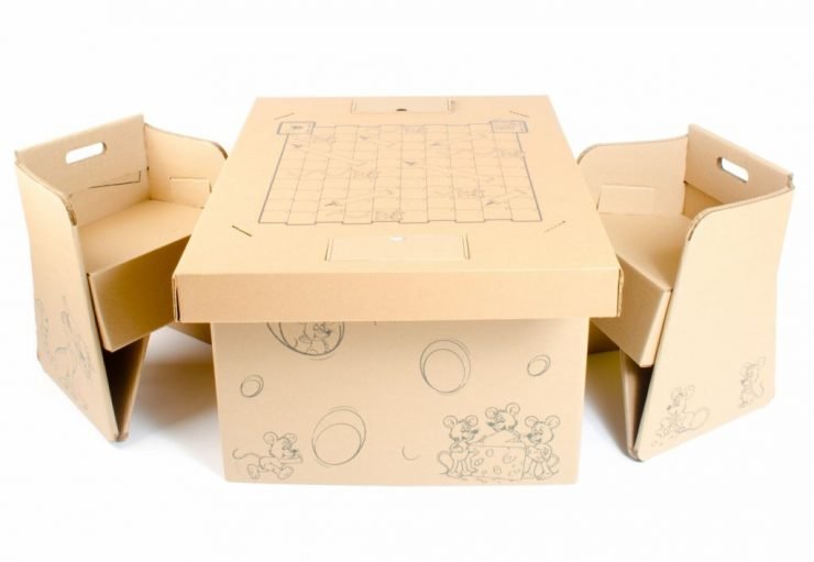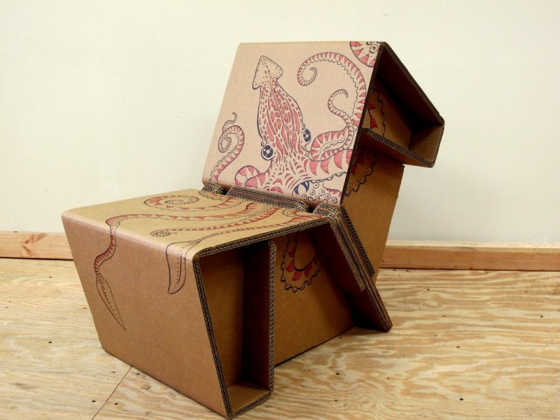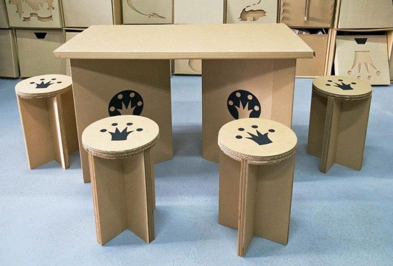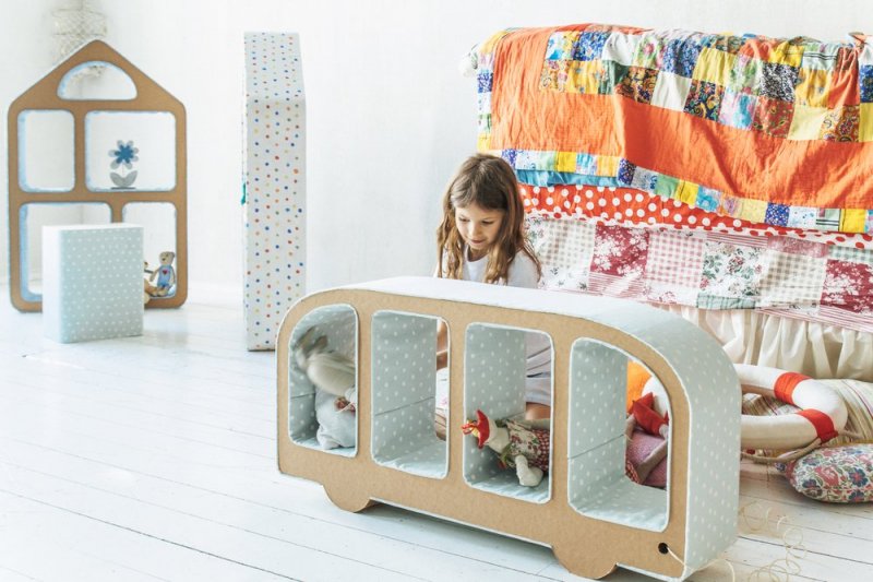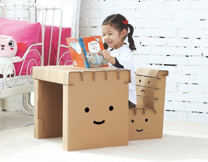 Прочность правильно сконструированных и обработанных готовых изделий из картона мало уступает мебели из ДСП и фанеры. Каждую комнату квартиры или дома можно удачно преобразить с помощью оригинальных предметов. На подоконнике в детской можно пристроить легкий домик для Барби, на полу разместить столик и стульчики из картона. Отлично будут смотреться напольные полочки из склеенного в несколько слоев картона в виде животных, человечков.
