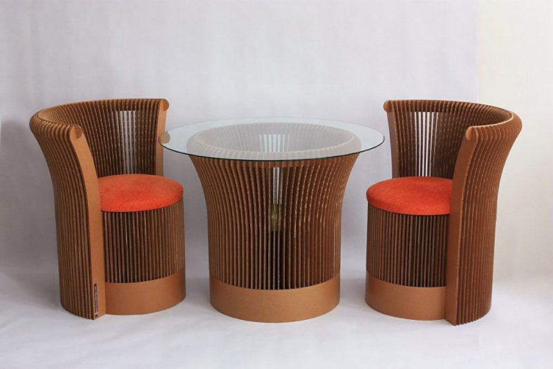 Дизайнерские столы и стулья из картона все чаще встречаются в кафе и ресторанах. Дешевые красивые предметы могут прослужить несколько месяцев, не потеряв первоначальный вид. Их можно быстро и просто заменить аналогичными, не нарушая общий стиль заведения.