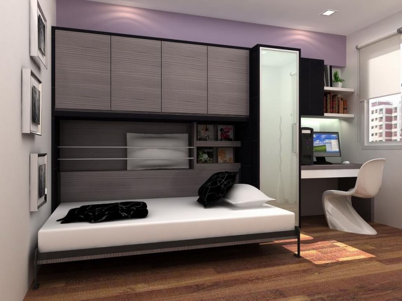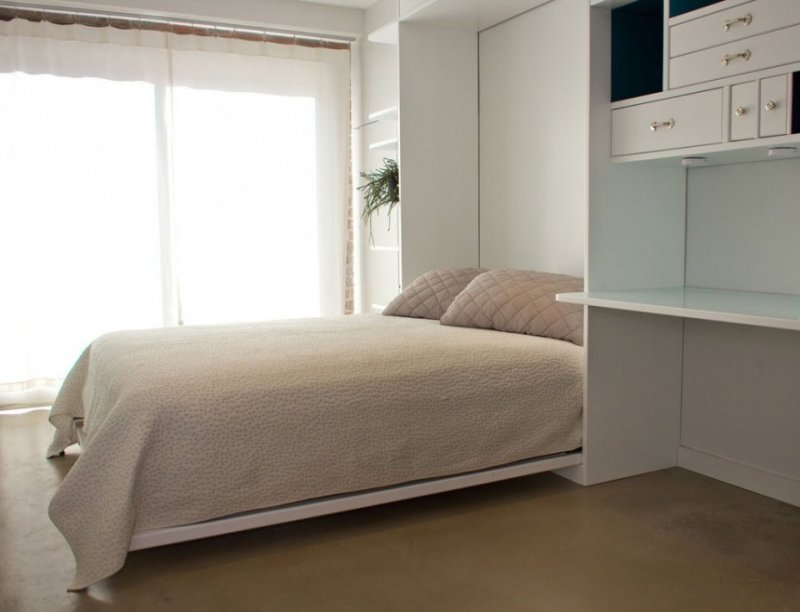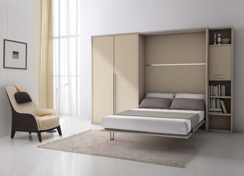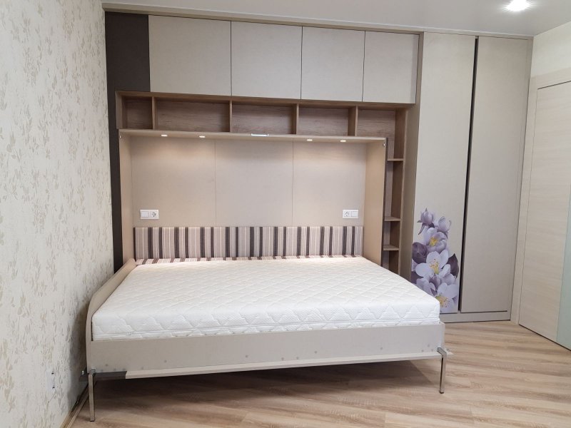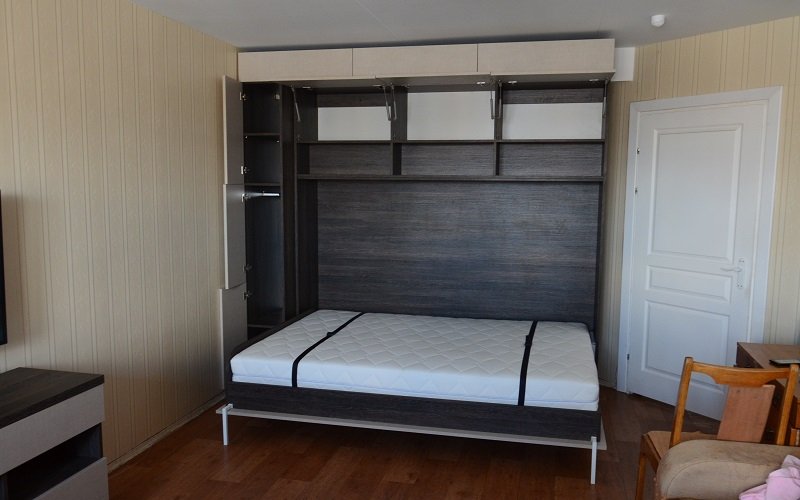 Компактные спальные места пользуются большой популярностью. Встроенным в шкаф кроватям отдают предпочтение даже владельцы просторных квартир. В ночное время – это удобное ложе для сна, а днем просторная зона для работы или отдыха. Матрас с каркасом прячется за красивым фасадом, принимая вертикальное положение. Откидная кровать-трансформер отлично впишется в любой интерьер. Она может убираться в нишу в любой жилой комнате.