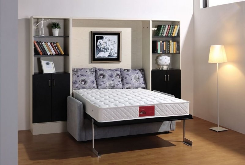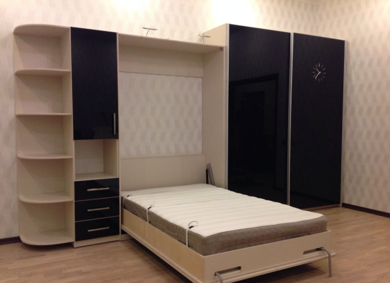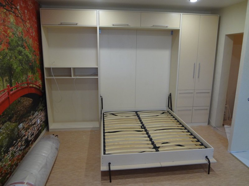 Люди, проживающие в малогабаритной квартире, постоянно сталкиваются с проблемой недостатка свободного пространства. На небольшой площади необходимо разместить много полезных и функциональных вещей, при этом должно оставаться достаточно места для комфортного и уютного существования. Используя мебель-трансформер, они частично решают свой вопрос, ведь откидная кровать, встроенная в шкаф, раскладной стол, помогают сэкономить драгоценные квадратные метры, совместить зону для отдыха с кабинетом, гостиной. Такие изделия не являются изобретением последних лет. Первым прототипом складных предметов можно назвать табурет, известный со времен Древнего Египта. Однако, отцом шкаф-кровати стал американец Уильям Л. Мерфи, который уже в 1900 году подал заявку на получение патента. За свою сравнительно недолгую историю конструкция была на пике популярности много раз. Востребованность в ней возрастает до и после экономического роста. Содержание Особенности конструкций Преимущества и недостатки Разновидности моделей Выкатные Откидные Поворотно-откидные Комбинированные Виды конструкций кровати согласно габаритам и типу строения Типы подъемных механизмов Пружинный Газовый Механизм на петлях Способ откидывания кровати Кровать-трансформер в интерьере комнат Гостиная-спальня Кабинет Детская На что обратить внимание при выборе в магазине Пошаговая технология самостоятельного изготовления шкафа-кровати Заключение Особенности конструкций Выбирая мягкую мебель для собственных нужд, человек стремится получить практичное, функциональное, долговечное, эстетичное изделие. Всеми этими качествами обладает трансформирующаяся кровать. Она, так же как и стандартные модели, состоит из двух основных элементов: каркаса, матраса. Однако имеет некоторые конструктивные особенности, которые зависят от конкретного вида: Ножки. Разложенная кровать опирается на специальные складные ноги, которые способны выдержать большие нагрузки. Они предназначены как для людей с избыточной массой тела, так и супружеских пар. В сложенном состоянии их не видно. Подъемный механизм. Есть пружинные, газовые, варианты на петлях. Короб (шкаф). Специальный элемент, в который встраивается конструкция Ремни. Применяются для фиксации постельного белья и матраса. Фальш-двери с ручками. Декоративный элемент, изображающий фасад шкафа. Ламельная система для опоры матраса. По типу используемого механизма трансформации можно выделить следующие варианты: Выкатывающиеся. Это самые компактные модели, состоят из складных секций, в сложенном состоянии уменьшаются втрое. Откидывающиеся. В неразложенном виде представляют собой фасадную часть шкафа. Подъем осуществляется благодаря пневматическим пружинам. Поворотно-откидывающиеся. Движение происходит за счет поворотных шарниров. Комбинированные. Одновременно выполняют несколько полезных функций. По функциональности выделяют следующие типы: применяемые исключительно для экономии места, например, стандартная шкаф-кровать, спрятанная за фасадом; многофункциональные изделия, позволяющие одну область в доме использовать для разных целей, например, диван-кровать, кровать-стол. Преимущества и недостатки Достоинства этой мебели оценили многие пользователи. Ее устанавливают в малогабаритных квартирах, для обустройства комп