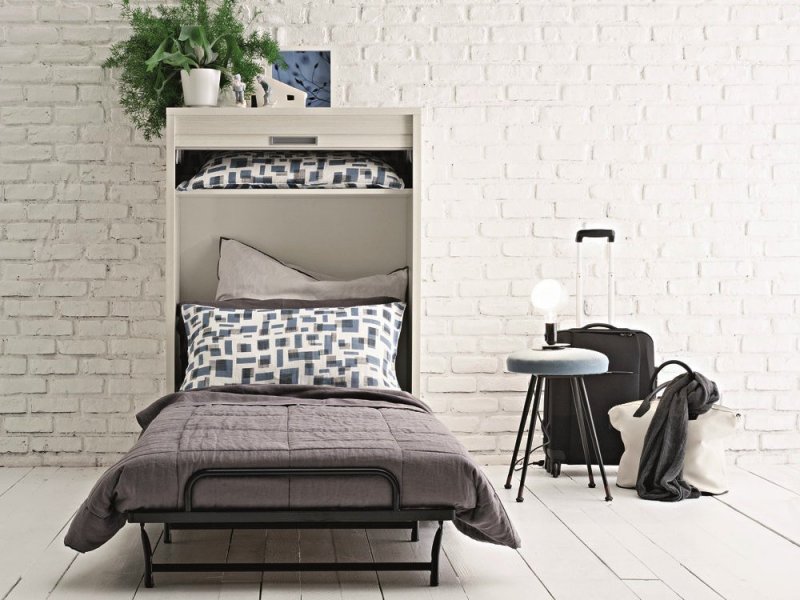 Кровать-диван, встроенная в шкаф. Устройство 3 в 1 – одно из самых практичных для малогабаритных помещений. Это отличная альтернатива обычным моделям, выполняющим только одну функцию. Однако это очень громоздкая конструкция, которая занимает много места вдоль стены. Ее можно крепить исключительно к бетонным и кирпичным перегородкам, способным выдержать огромную нагрузку.