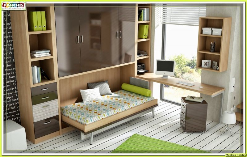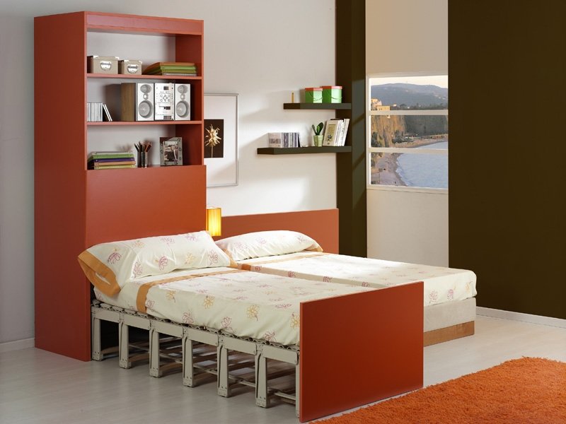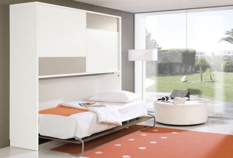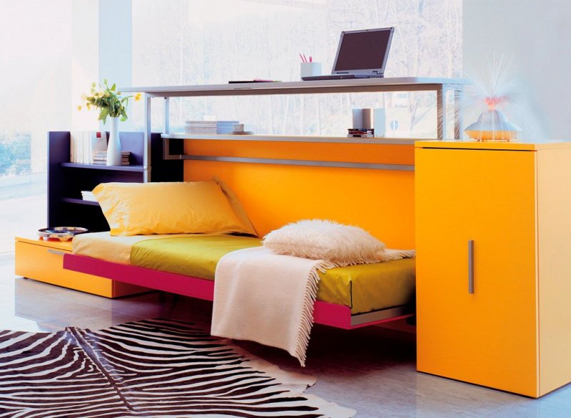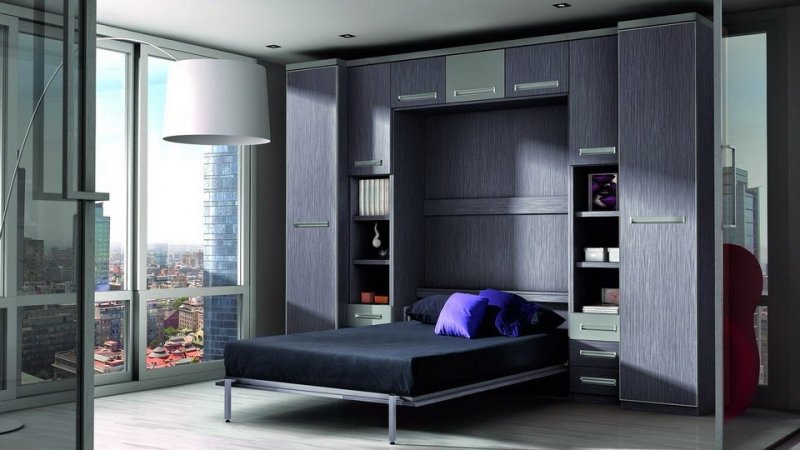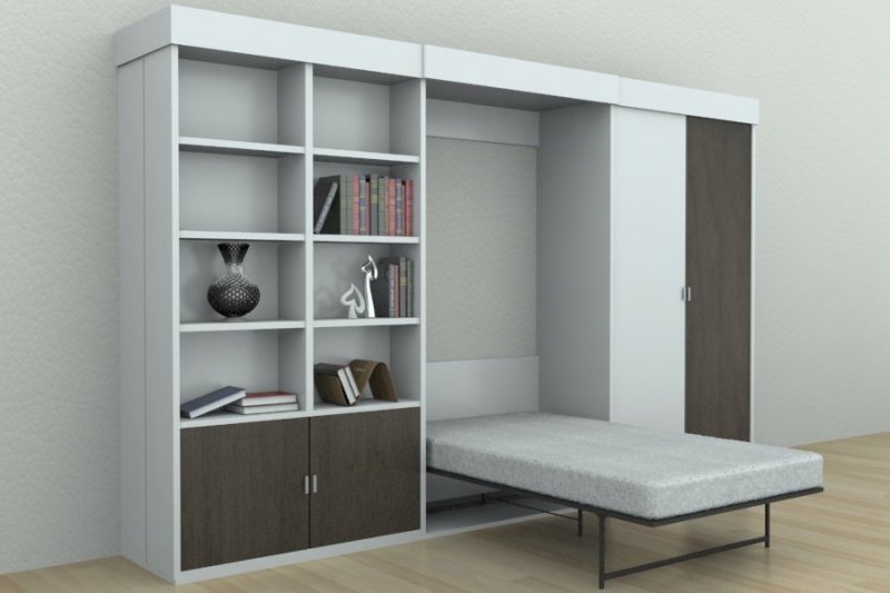 Такие предметы мебели могут одновременно выполнять несколько функций. Единая конструкция может состоять из шкафа, удобных ящиков, кровати, стеллажа. Некоторые модели могут трансформироваться в диван с последующим горизонтальным разложением всех частей.