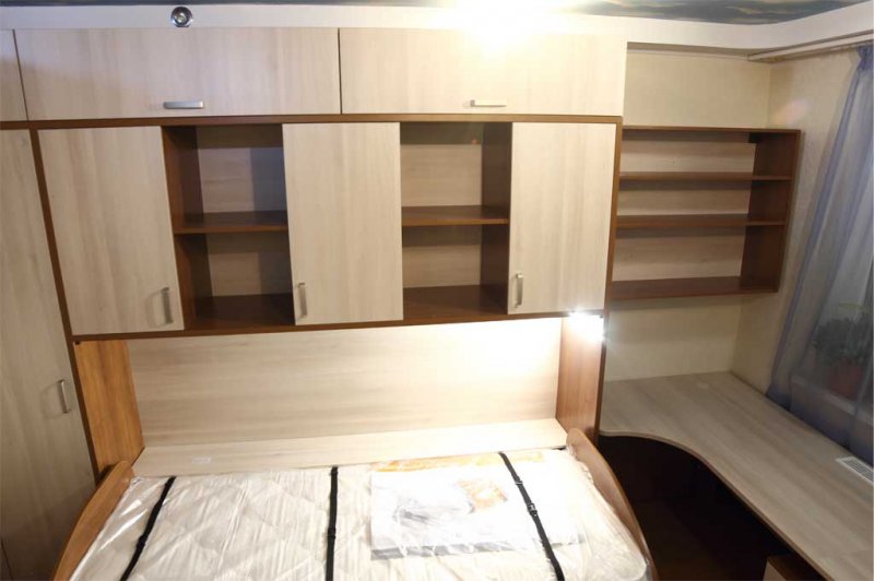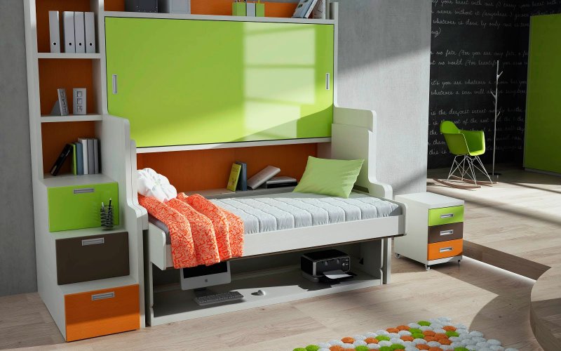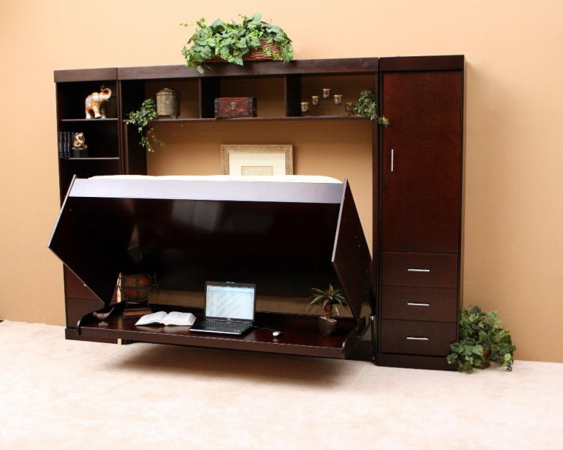 Кровать-стол, встроенная в шкаф. Включает три основных элемента: шкафчик, кроватку, стол. Длина последнего зависит от ширины спального места. При выборе изделия необходимо уделить внимание высоте рабочего стола, от чего зависит корректное положение тела человека во время работы за ним.