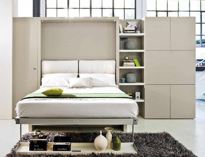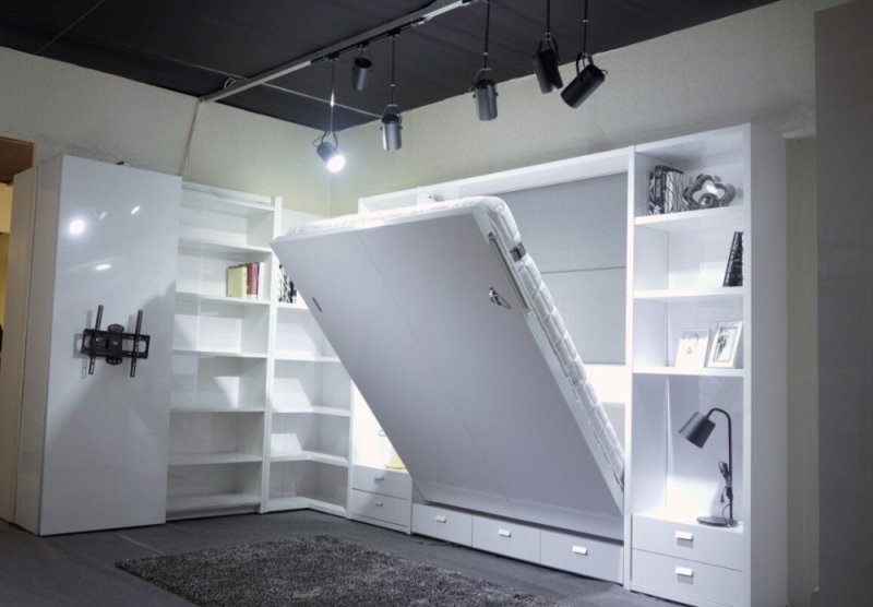 В специальную конструкцию, в которой сложенная кровать будет удачно скрывать содержимое полок.