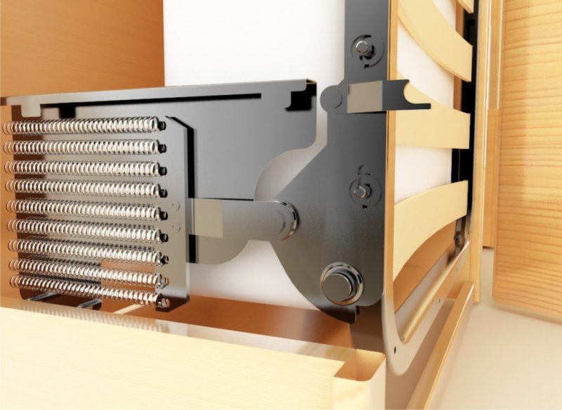 Работа пружин заключается в плавном раскладывании трансформера, замедлении отведения матраса от корпуса. Универсальный подъемник работает с помощью системы витых пружин. На металлические элементы приходится основная нагрузка. Средний срок службы – до 5-и лет.