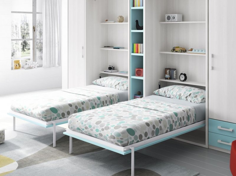 Двухъярусные кровати, встроенные в шкаф. Представляют собой систему, состоящую из двух односпальных коек, которые откидывают горизонтально. В конструкции предусмотрена лестница. Разобрать ее на две составные части не получится. Стандартный размер секции составляет 70х190 см.