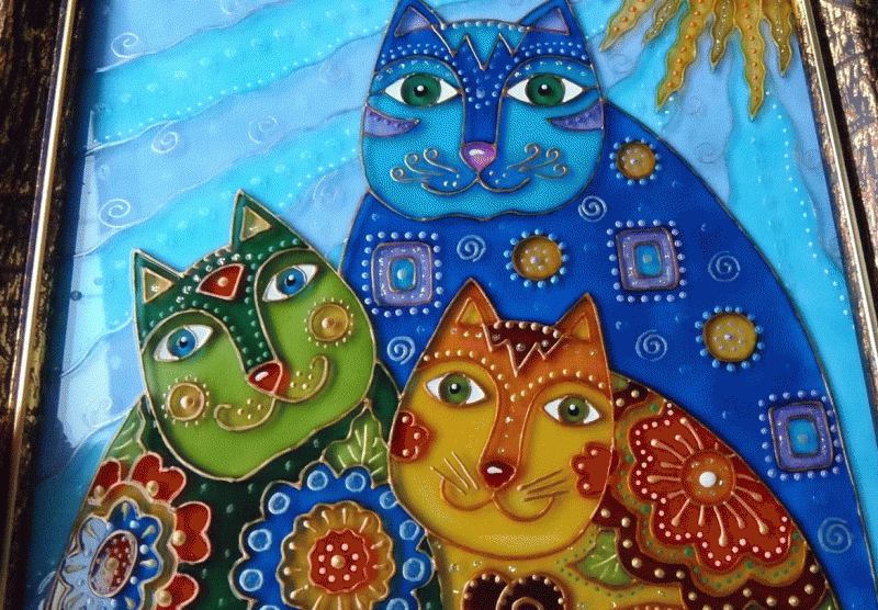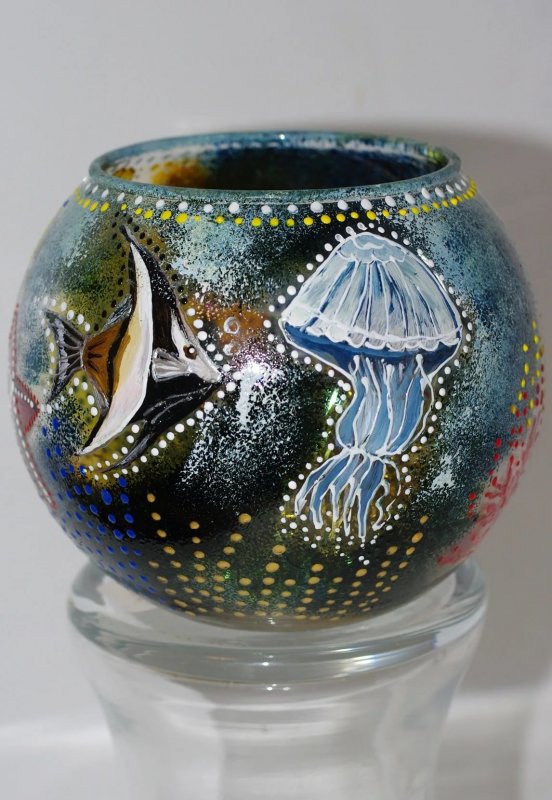 Расписной. Разукрашены абсолютно все участки стекла. Краски жидкие, растекаются и смешиваются, создавая разводы, новые оттенки;