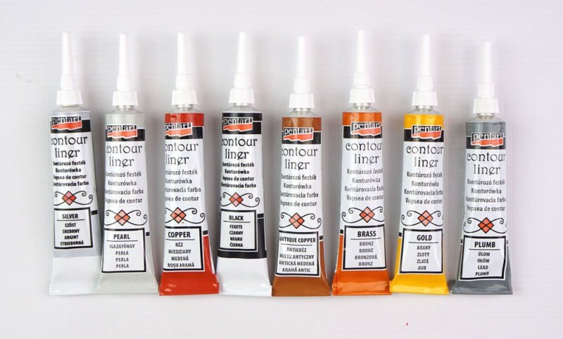 Аутлайнер. Цветная паста в тюбике ложится тонким узором на любую поверхность. После затвердевания образует рельефный контур, который препятствует растеканию краски;