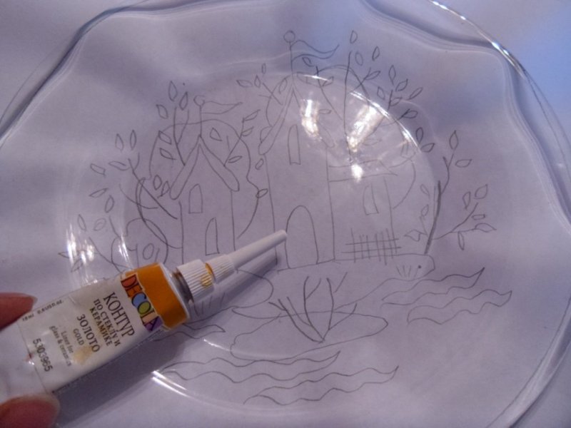 Подложить эскиз под стекло. Расположив изображение под стеклянной поверхностью, с помощью контура по стеклу перерисовать его сверху. Способ отлично подойдет для плоских, ровных прозрачных предметов. Если элемент имеет округлую, сложную форму, где невозможно прикрепить бумагу, даже с использованием скотча, ее необходимо немного намочить в воде, после чего она станет податлива, примет практически любую форму, будет хорошо держаться на стекле без дополнительных фиксаторов.