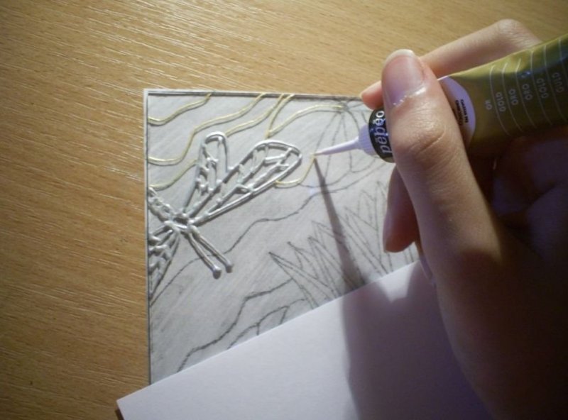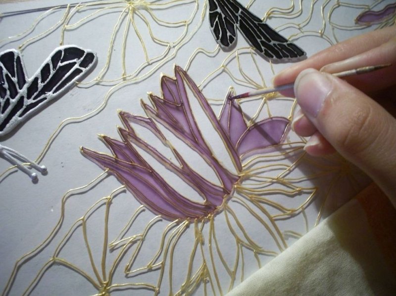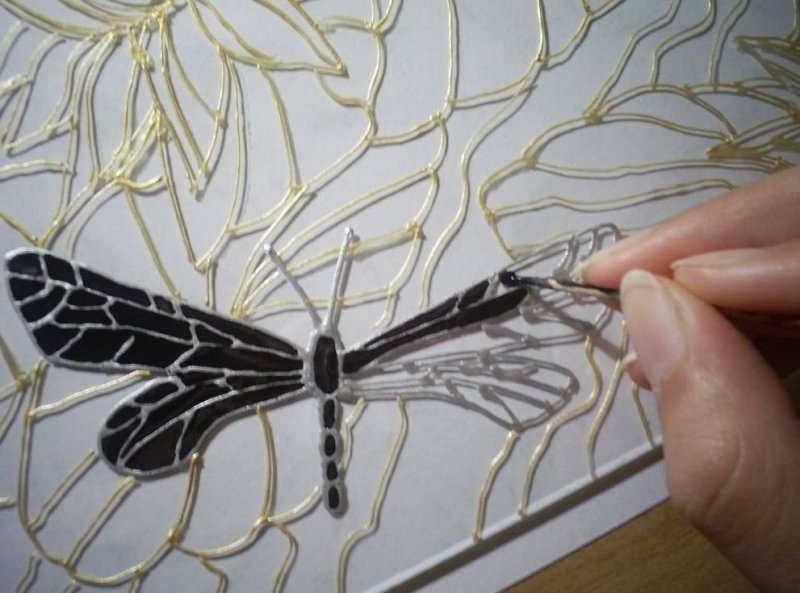 Для работы потребуются пленочные краски необходимых цветов, ацетатная пленка или обычный файл, если шаблон небольшого размера. Помещаем рисунок под прозрачную пленку и обводим его контур при помощи специального моделирующего контура. Любые неровности можно исправить простой зубочисткой или спичкой. Теперь картинку следует оставить на 12 часов для высыхания.