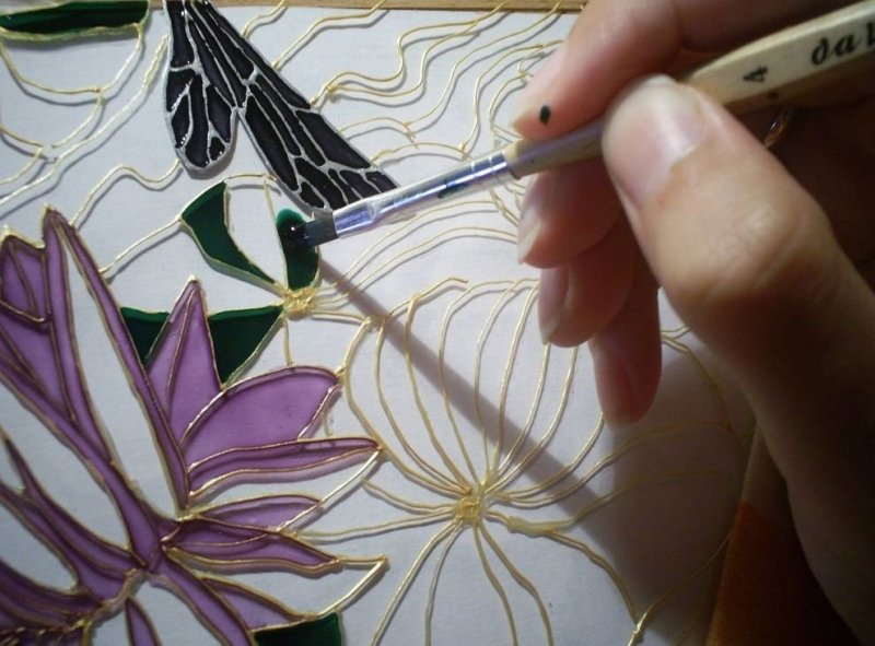 Витражные краски отличаются тем, что они сильно растекаются, поэтому не рекомендуется наносить другую расцветку до полного высыхания предыдущей, чтобы избежать возможности смешивания цветов. Также для работы лучше использовать лаковые вещества на основе органических смол.