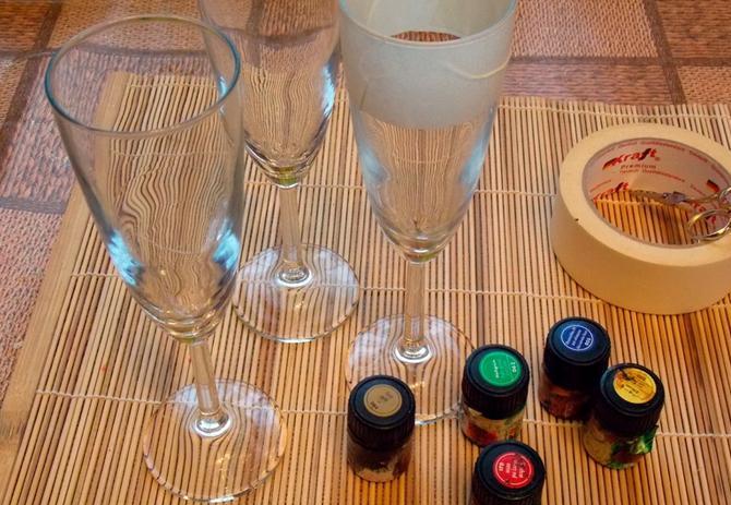 Обезжириваем фужеры при помощи ветоши и спирта, заклеиваем строительным скотчем верхний край и погружаем предметы поочередно в воду;
