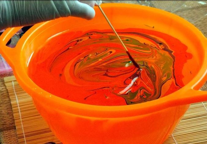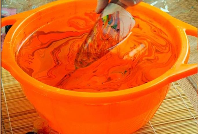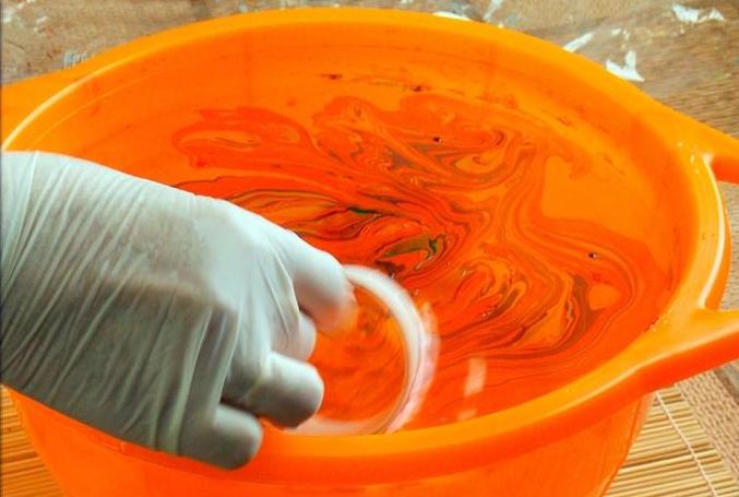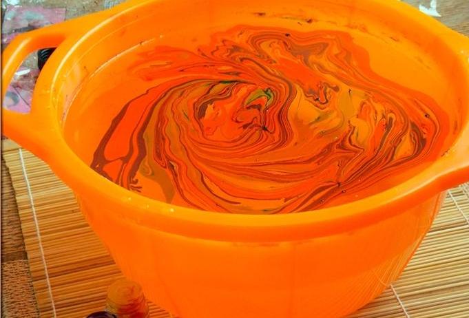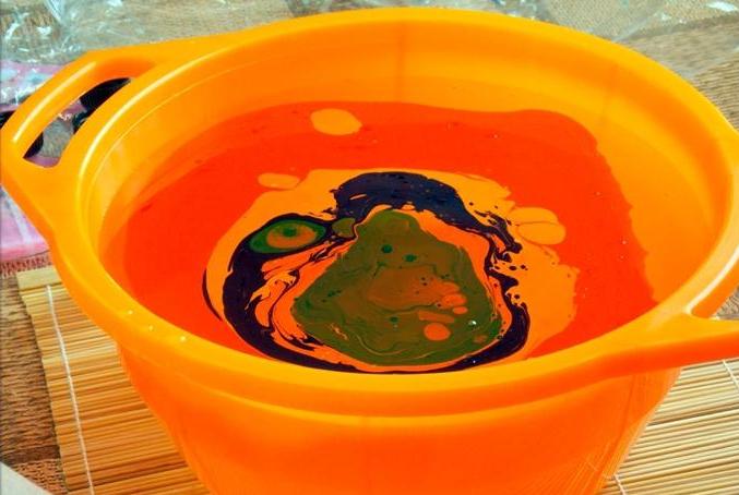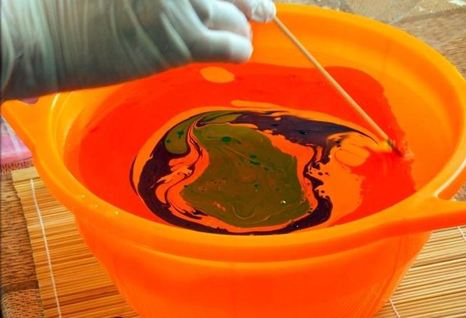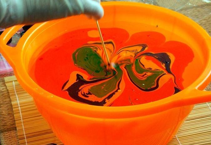 Наполняем глубокую емкость водой, капаем в центр несколько капель краски для марморирования;