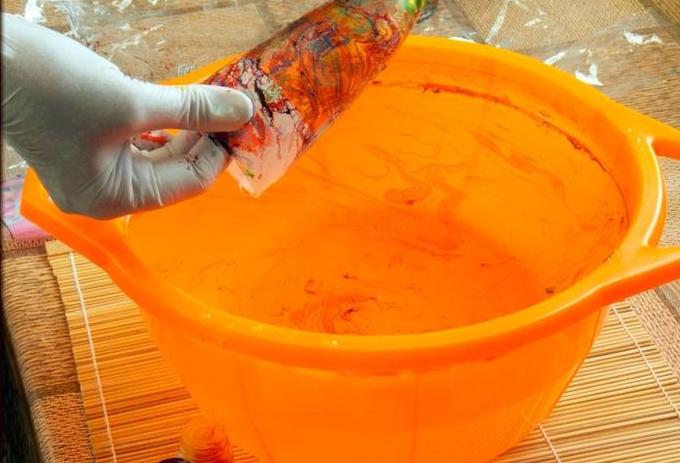 Желатиново-анилиновая смесь. Готовится непосредственно перед работой. Такую краску нельзя хранить, поэтому следует замешивать раствор только на один раз. Для приготовления потребуется залить 10 г желатина тремя столовыми ложками горячей воды, подготовить порошковые анилиновые красители, смешать все вместе. Текучесть смеси зависит от ее температуры;
