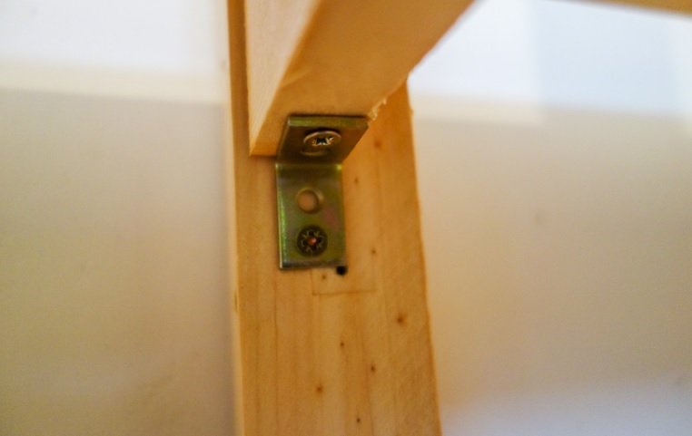 Боковые части соединяются с нижней полкой с помощью уголка и саморезов.