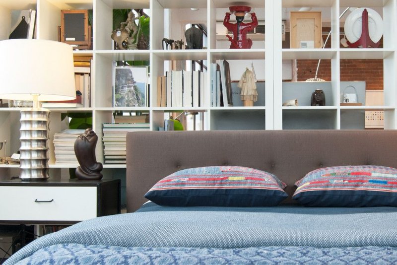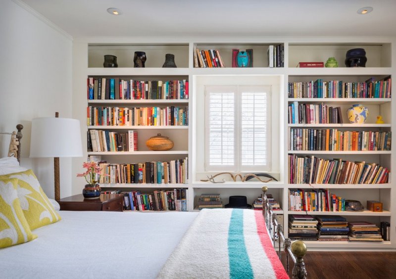 Стеллаж в спальне часто располагают вдоль одной из стен, встроив в него телевизионную или аудиосистему. Интересный вариант — поставить кровать, таким образом, чтобы ее изголовье стало центром композиции системы хранения. Хорошее решение для вытянутых комнат — выстроить стеллаж вдоль короткой стены, на которой находится окно. Это визуально сделает комнату более квадратной и позволит не занимать и без того узкое пространство вдоль длинных стен.