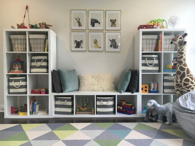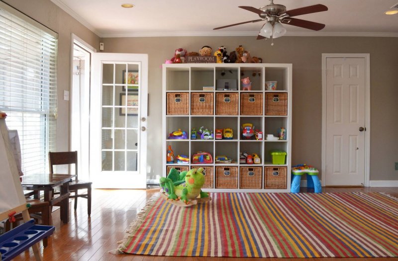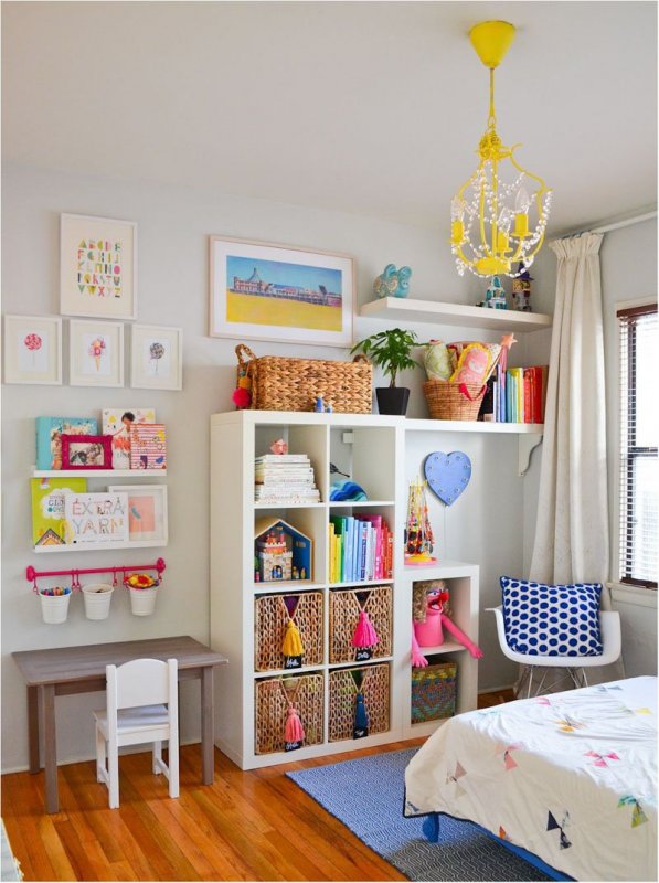 Кавардак, который обычно присутствует в детской – головная боль практически каждой мамы. Очень сложно поддерживать порядок, если в комнате ребенка нет удобного места для хранения. Раскладывание игрушек по шкафам и выдвижным ящикам занимает уйму времени. Отличный выход из положения – установить стеллаж с вместительными корзинами. Эти красивые изделия выполняют также и декоративную функцию. Отныне все, что нужно будет сделать – пройтись с корзиной по комнате, собрать в нее игрушки и отправить ее на полку.