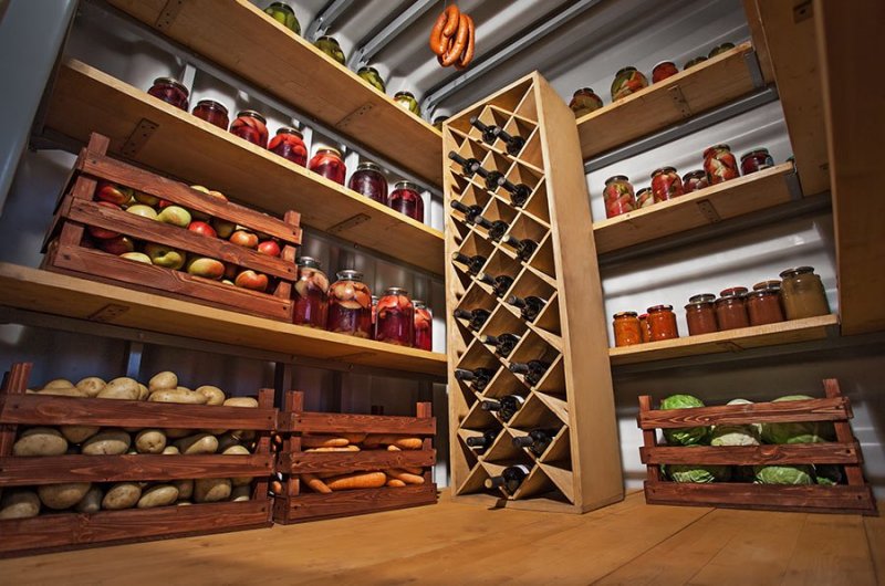 Погреб – традиционное место для хранения запасов – овощей, домашних заготовок овощей, грибов, колбас, сырокопченых продуктов, самодельного алкоголя – вина, наливок и прочего. Размеры стеллажа для этого помещения зависят от его габаритов и количества продуктов, которые планируется здесь размещать. Толщина полок должна быть достаточной, чтобы выдержать вес тяжелых банок и корзин.