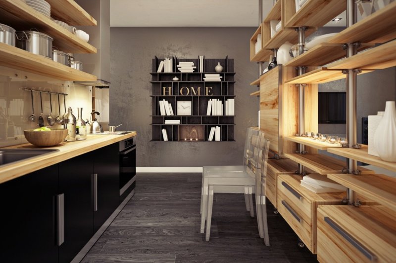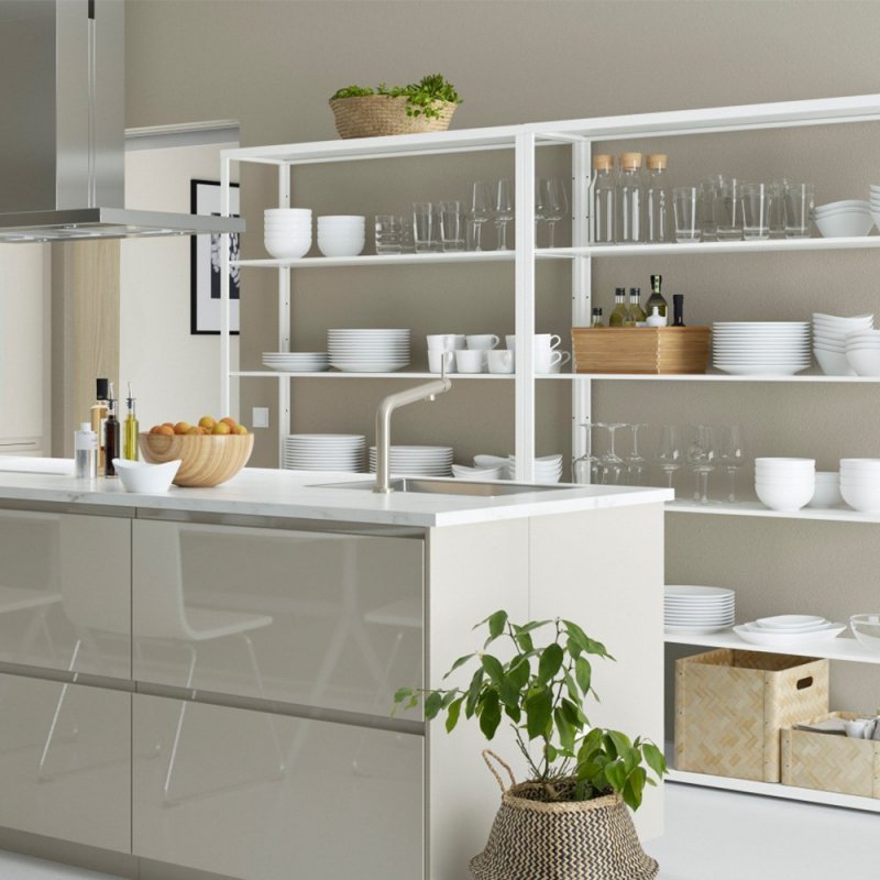 Во время приготовления еды часто бывает нужно быстро взять с полки необходимые специи, посуду, книжки с рецептами. С полок стеллажа можно достать все нужное за секунду и так же быстро расставить используемые предметы по местам. Отсутствие необходимости открывать дверцы, выдвигать ящики существенно экономит время и силы хозяйки.